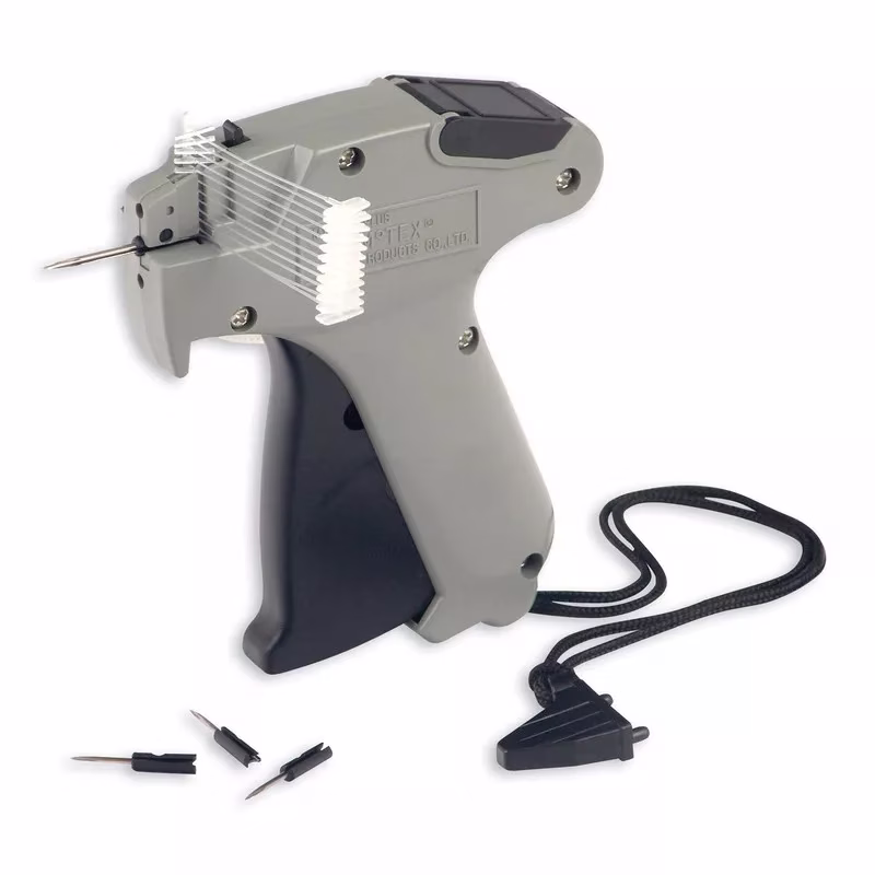 Работает игловой пистолет так. Сверху к нему подсоединяются пластиковые держатели. Ткань, кожа или прочий материал прокалывается полой иглой, внутри которой находится маленький штифт. Когда нажимаешь на курок пистолета, он выстреливает и проталкивает держатель вперед. Когда вынимаешь устройство из материала, выходит верхний конец держателя. В итоге ярлычок надежно крепится к изделию.