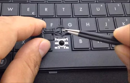 Снимаем все клавиши. Так мы получим доступ к пространству под клавишами. Для этого подойдут, например, тонкие предметы. Можно использовать петельки из медной проволоки. Есть модели, в которых первым делом изымают кнопки и лишь потом снимают пленки. Кнопки можно снять, взяв в руки нож или маленькую отвертку.