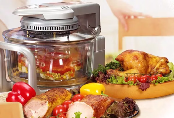 Этот прибор многофункциональный. Он предоставляет домохозяйке возможность готовить любые блюда, используя циркуляцию горячего воздуха в колбе. Устройство имеет вид стеклянной емкости с металлическим кольцом, которая располагается на подставке и которая закрывается герметичной крышкой.