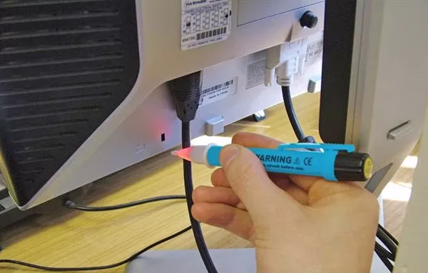 При необходимости провести проверку обесточенного провода, чтобы узнать, есть ли обрыв его жилы, необходимо прикосновение отверткой к одному его краю. Второй край нужно взять рукой. При этом на индикаторе придавливают пальцем контакт.