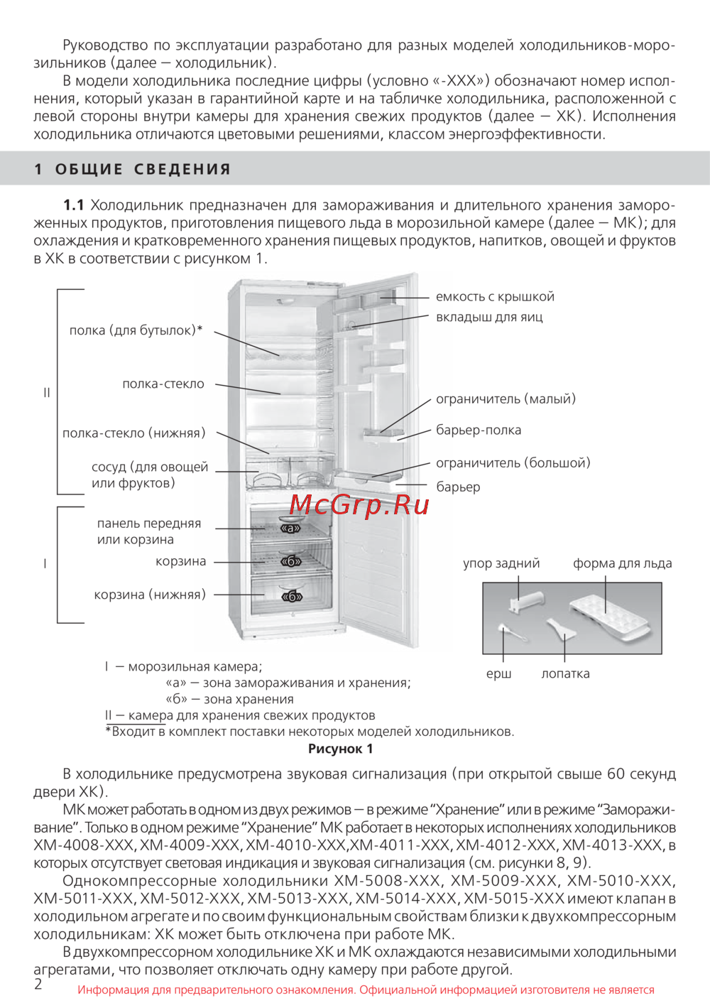 - В холодильнике предусмотрена звуковая сигнализация при открытой свыше 60 секунд двери хк мк может работать в одном из двух режимов в режиме хранение или в режиме заморажи вание только в одном режиме хранение мк работает в некоторых исполнениях холодильников хм 4008 ххх хм 4009 ххх хм 4010 ххх хм 4011 ххх хм 4012 ххх хм 4013 ххх в которых отсутствует световая индикация и звуковая сигнализация см рисунки 8 9 однокомпрессорные холодильники хм 5008 ххх хм 5009 ххх хм 5010 ххх хм 5011 ххх хм 5012 ххх хм 5013 ххх хм 5014 ххх хм 5015 ххх имеют клапан в холодильном агрегате и по своим функциональным свойствам близки к двухкомпрессорным холодильникам хк может быть отключена при работе мк в двухкомпрессорном холодильнике хк и мк охлаждаются независимыми холодильными агрегатами что позволяет отключать одну камеру при работе другой p.2