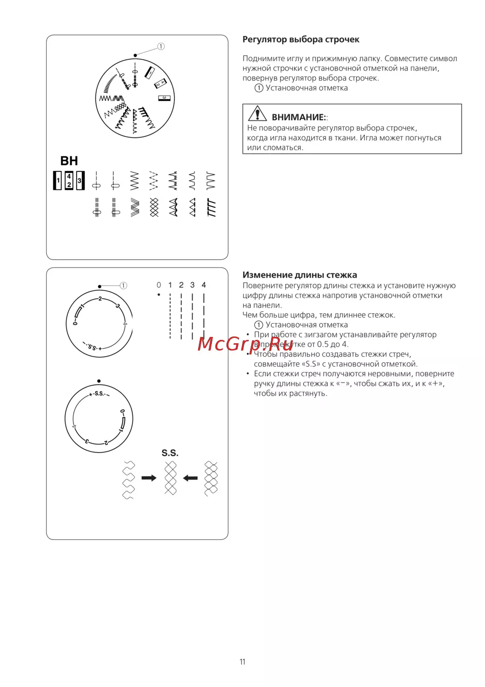 ручку длины стежка к «–», чтобы сжать их, и к «+»,
