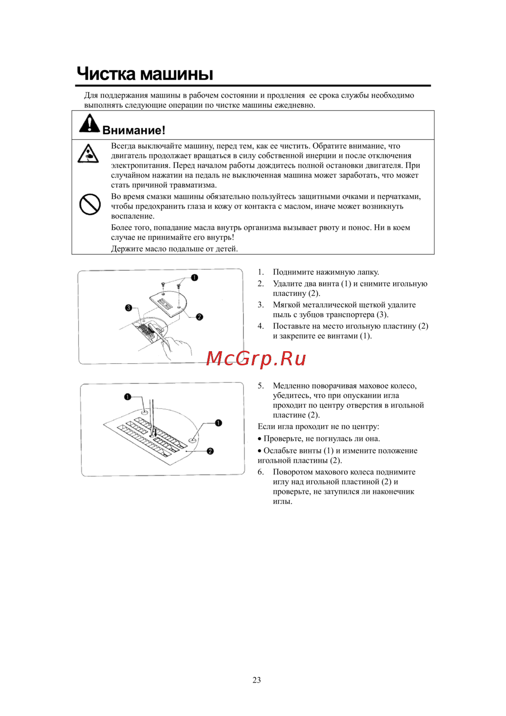 - Настройка синхронной работы иглы и вращающегося фиксатора шпульного колпачка p.21