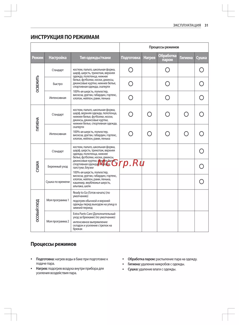 - Режим настройка тип одежды ткани подготовка нагрев обработка паром гигиена сушка p.31