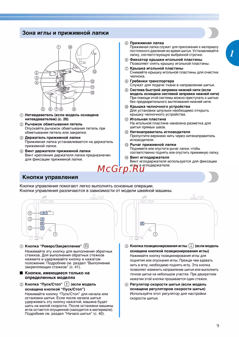 Кнопки управления различаются в зависимости от модели швейной машины.