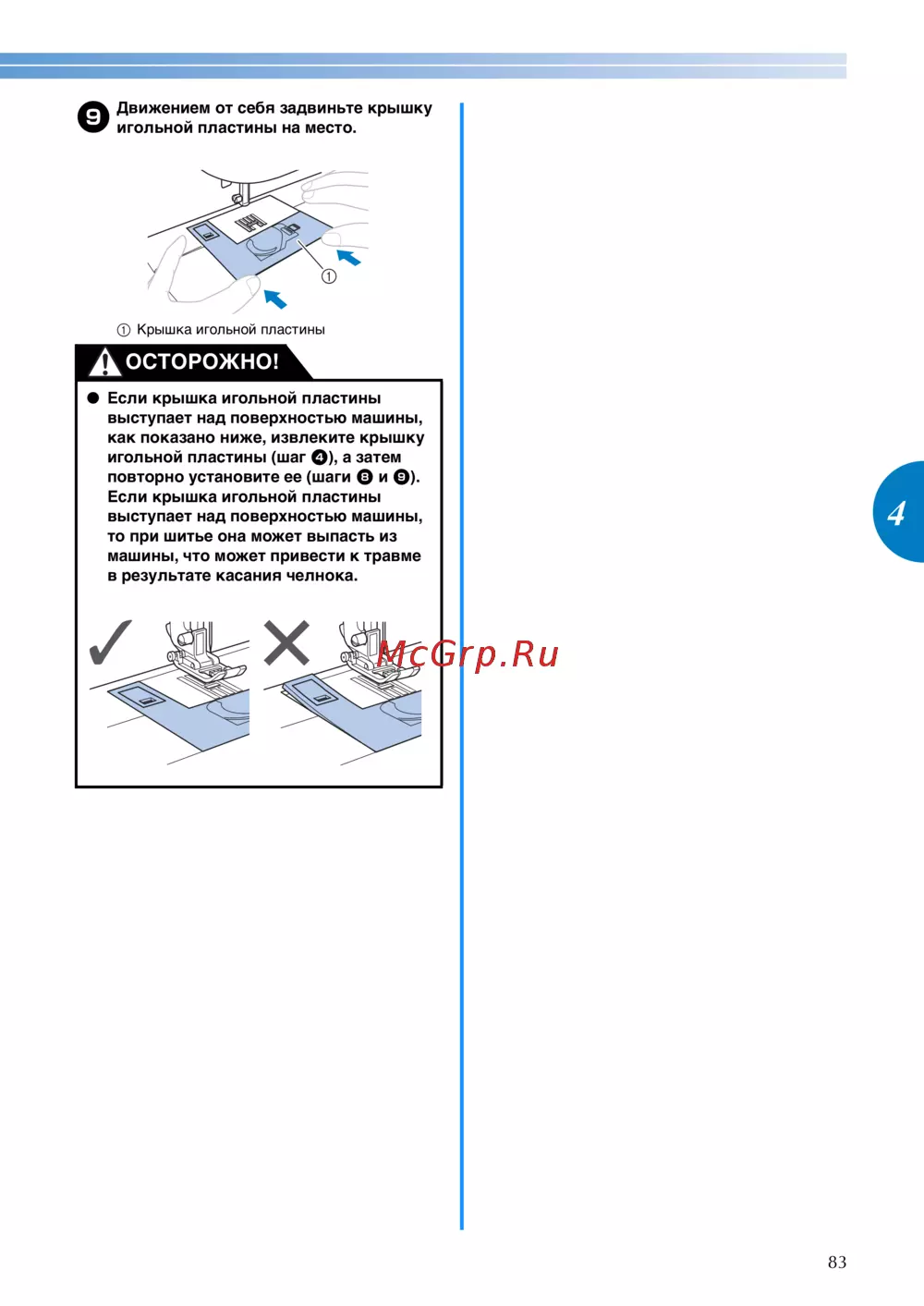 - Прежде чем заменять прижимную лапку обязательно выключите питание машины p.70
