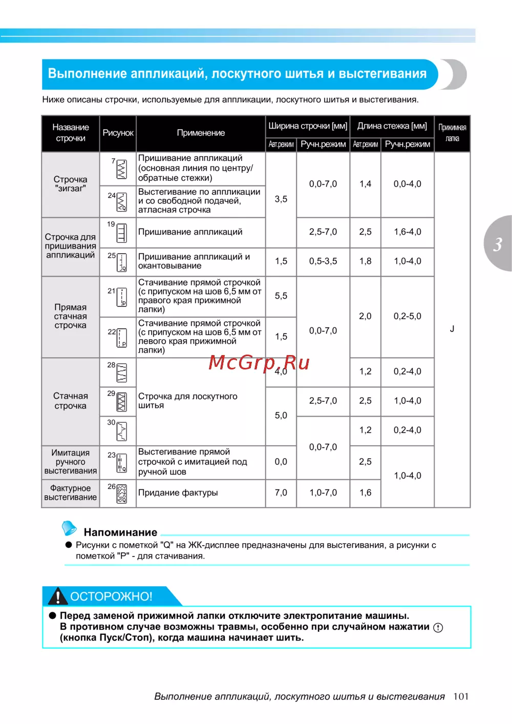 - Убедитесь в том чтобы игла была поднята во время движения пялец если игла будет находиться внизу она может сломаться и стать причиной травм p.159