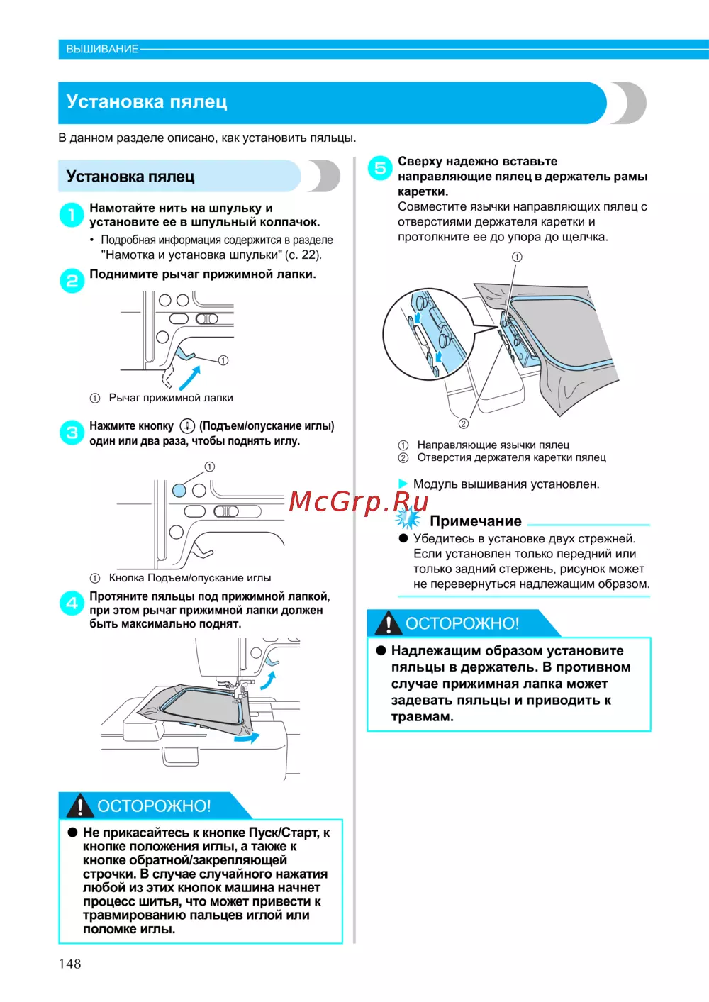 - Используйте пяльцы размер которых соответствует размеру рисунка вышивания в противном случае прижимная лапка может задеть пяльцы что может стать причиной поломки иглы или травм p.164
