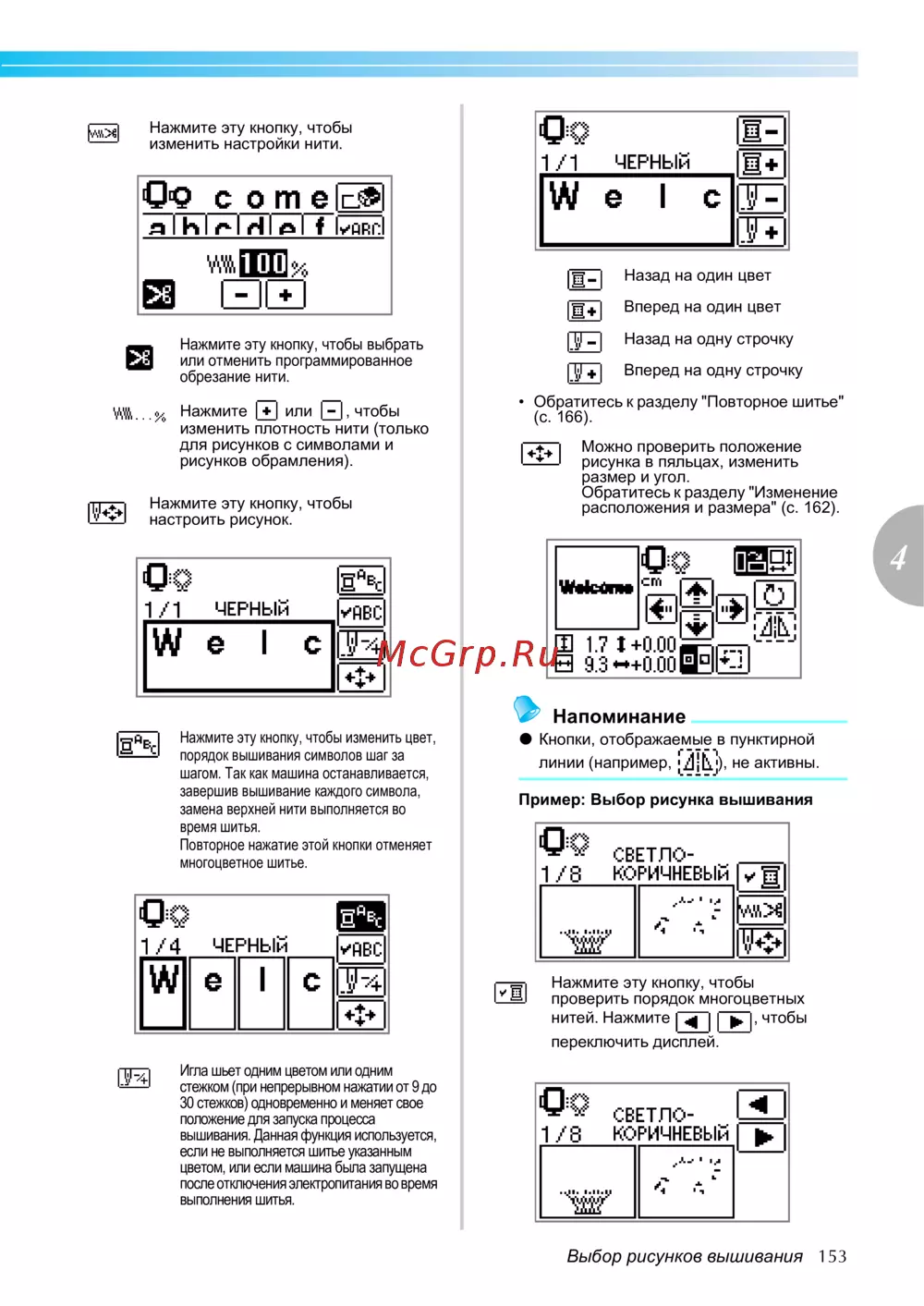 - Пересылка рисунков вышивания с компьютера на машину p.173
