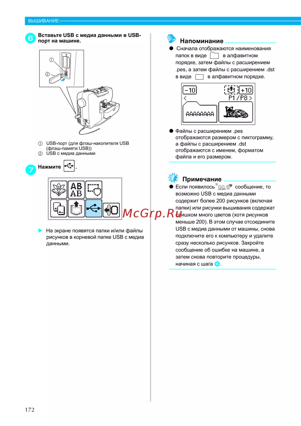 - Пересылка рисунков вышивания с компьютера на машину p.173