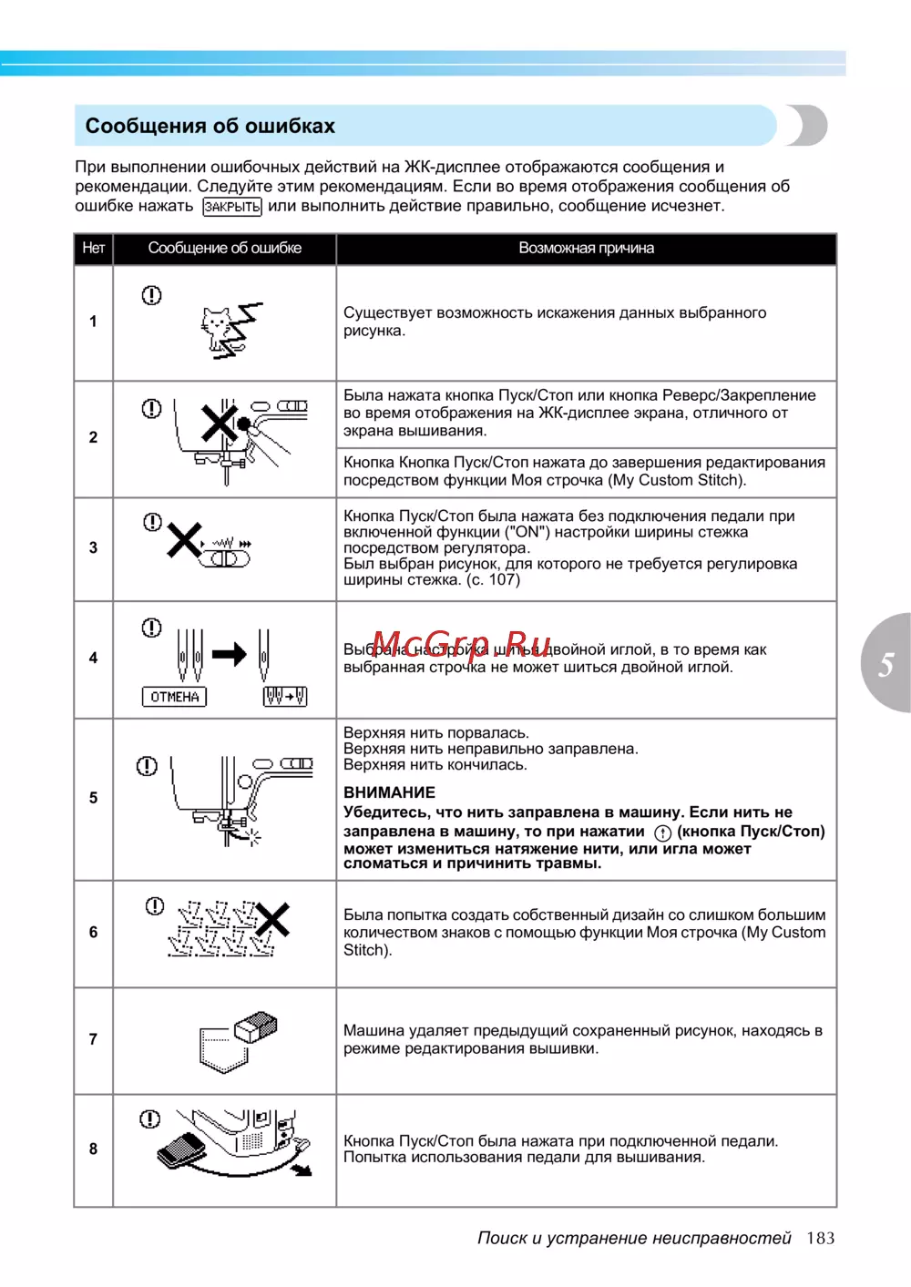 Brother NV 950 E [185/196] При выполнении ошибочных действий на жк дисплее отображаются сообщения и рекомендации следуйте этим рекомендациям если во время отображения сообщения об ошибке нажать или выполнить действие правильно сообщение исчезнет