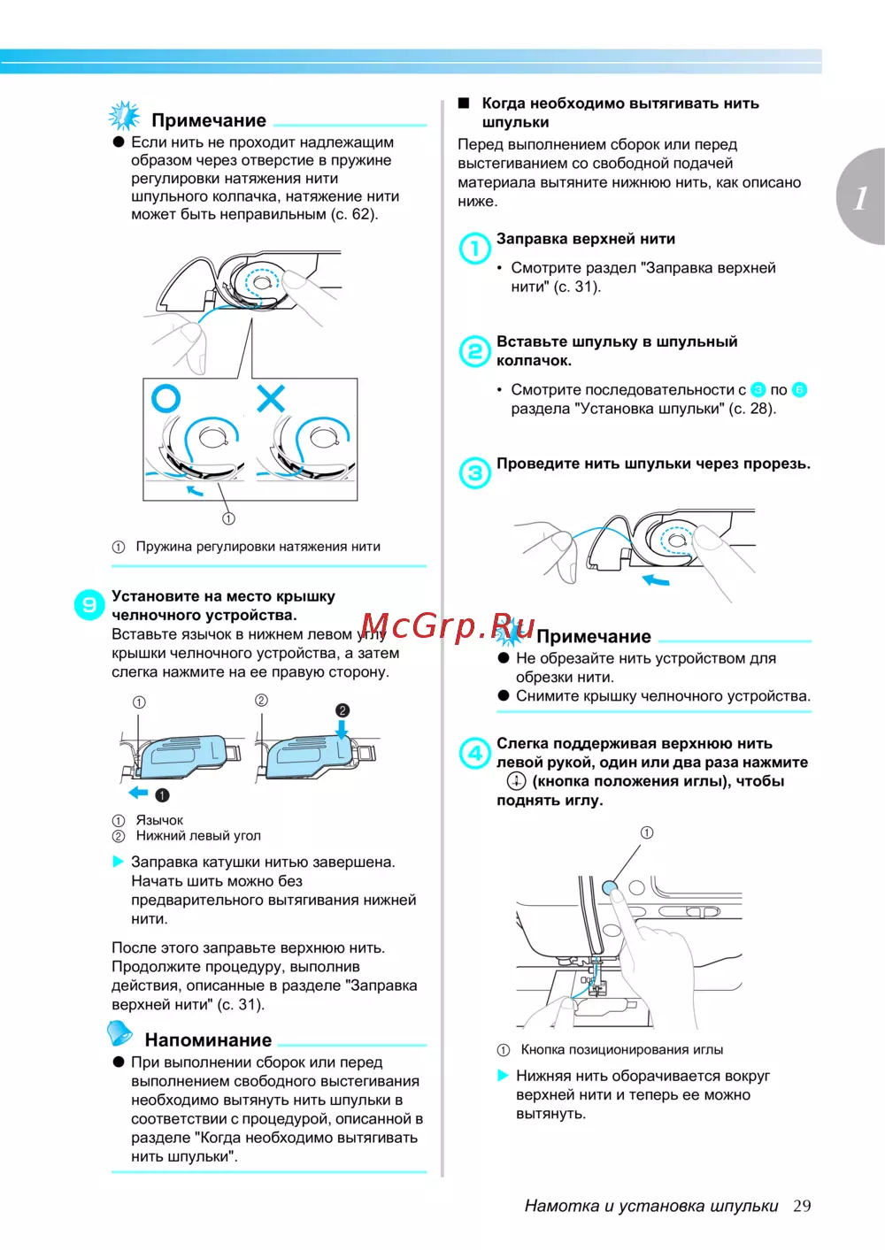 - Не используйте поцарапанный шпульный колпачок в противном случае верхняя нить может запутаться игла сломаться а также может ухудшиться качество шитья заказать новый шпульный колпачок номер по каталогу xe7560 001 зеленая маркировка можно в ближайшем сервисном центре проверьте правильность установки шпульного колпачка в противном случае возможна поломка иглы p.179