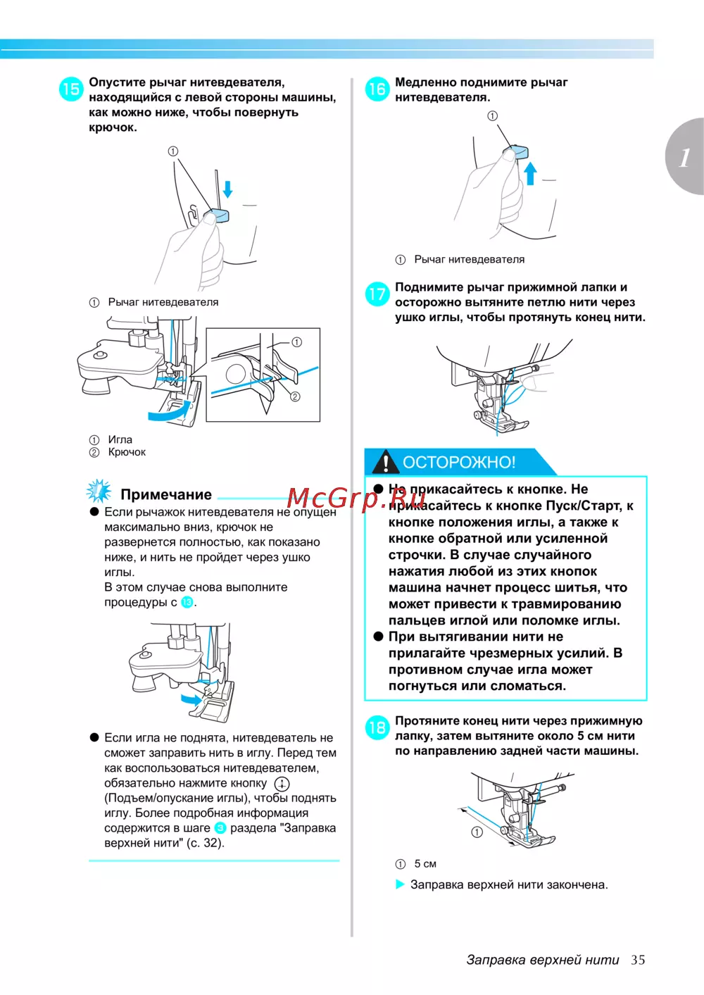 - Убедитесь в том чтобы игла была поднята во время движения пялец если игла будет находиться внизу она может сломаться и стать причиной травм p.159