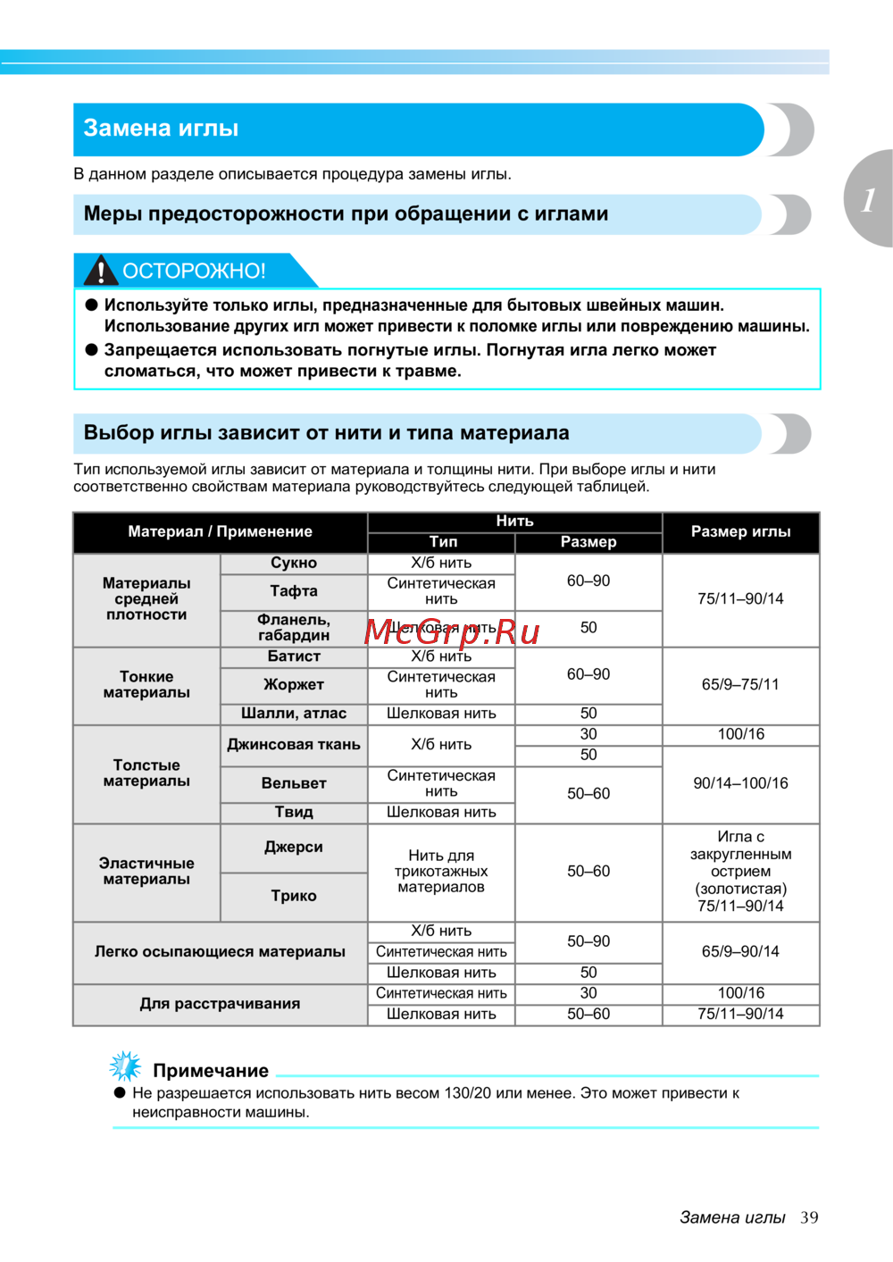 z Не разрешается использовать нить весом 130/20 или менее. Это может привести к