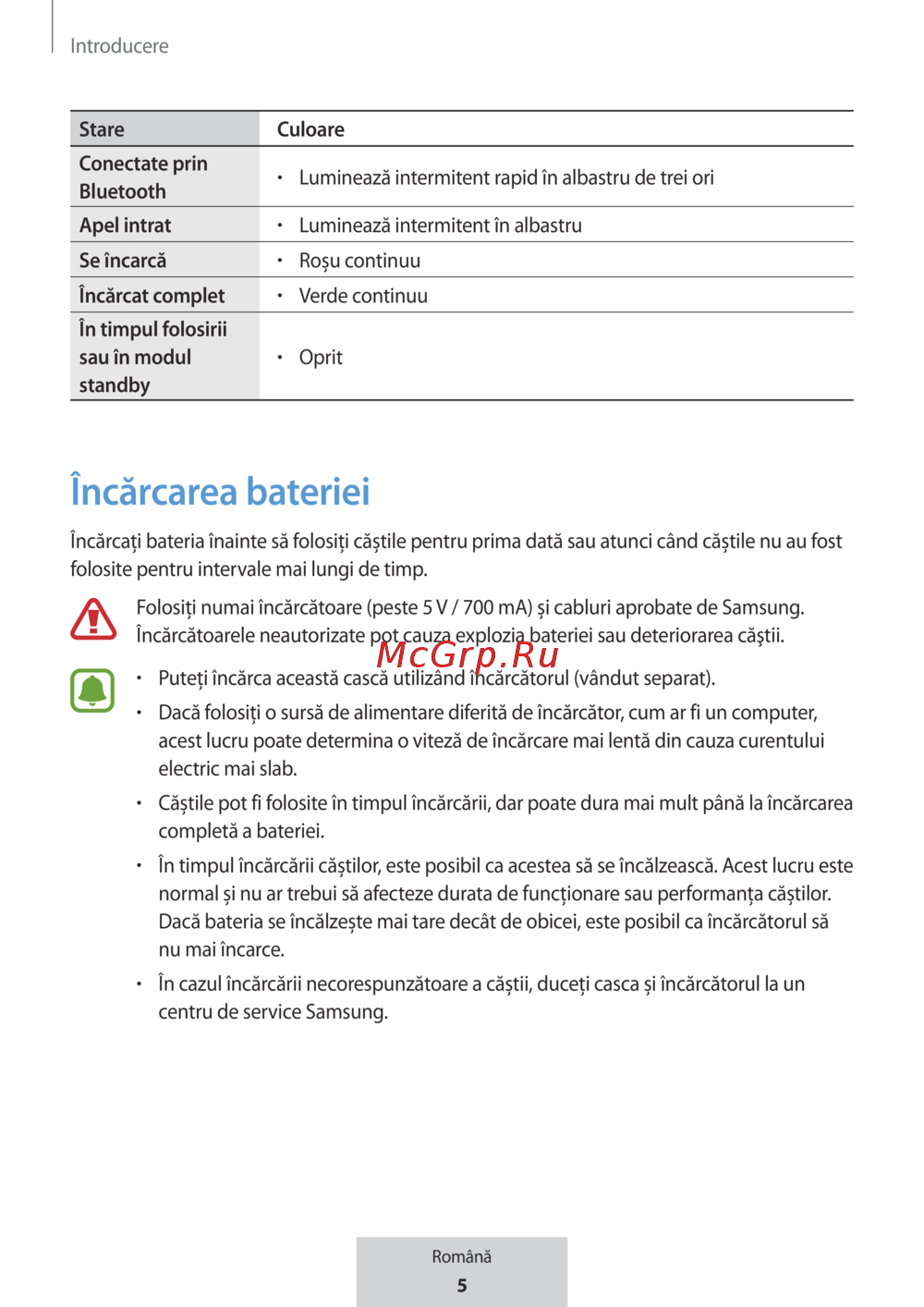 Folosiți numai încărcătoare (peste 5 V / 700 mA) și cabluri aprobate de Samsung.