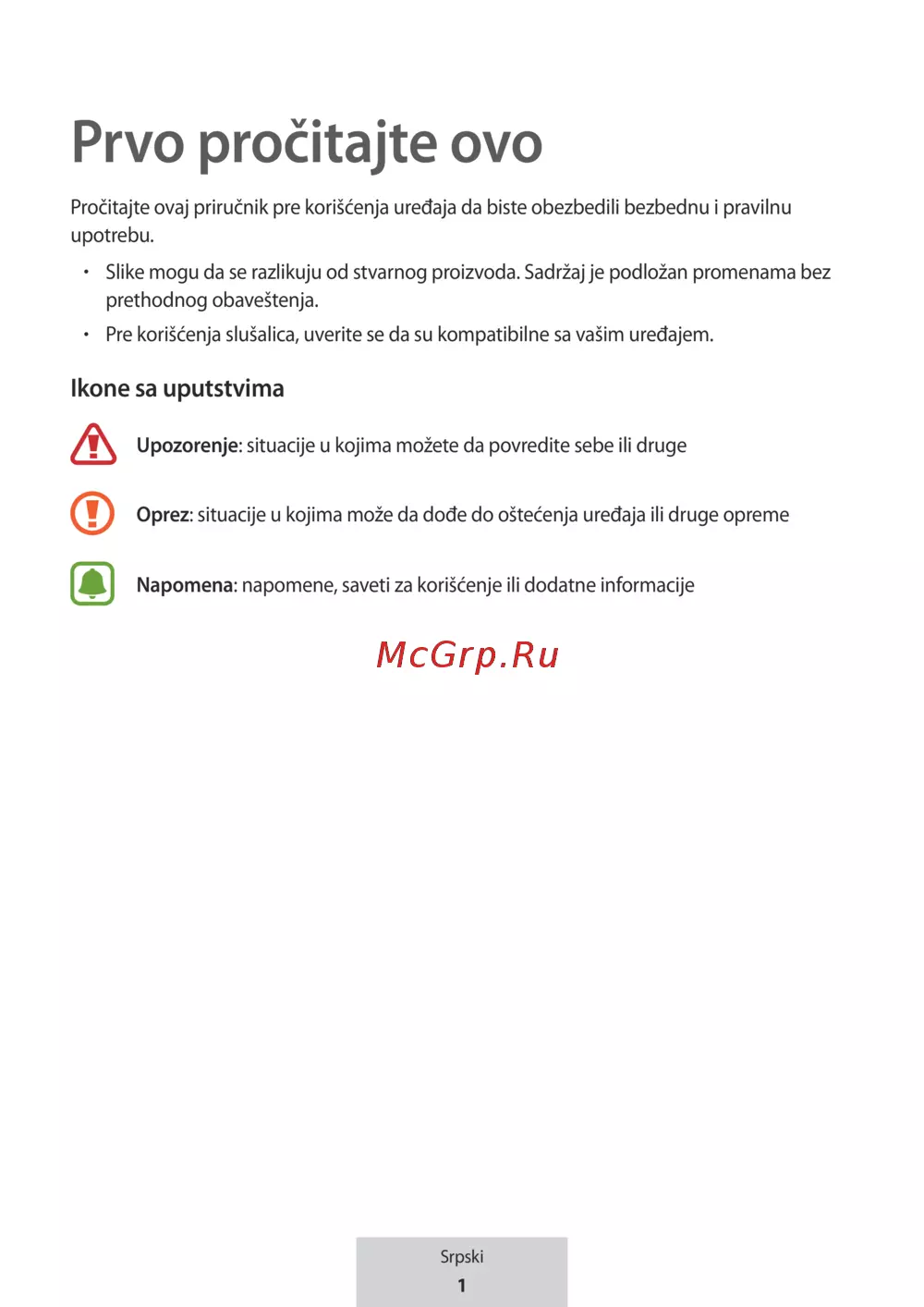 Pročitajte ovaj priručnik pre korišćenja uređaja da biste obezbedili bezbednu i pravilnu