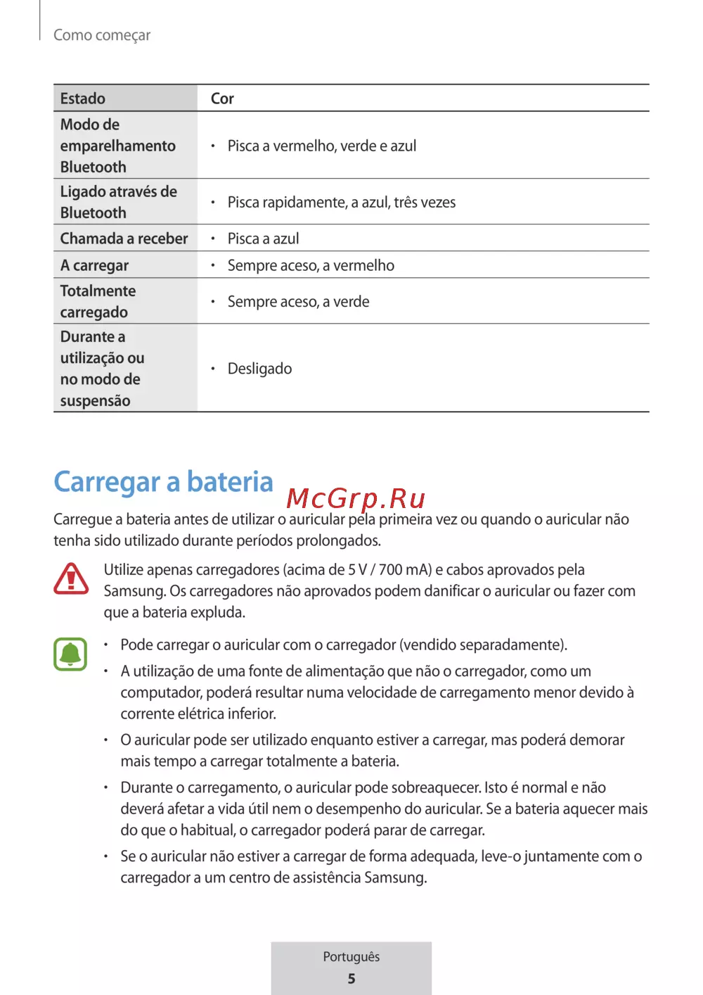 Samsung. Os carregadores não aprovados podem danificar o auricular ou fazer com