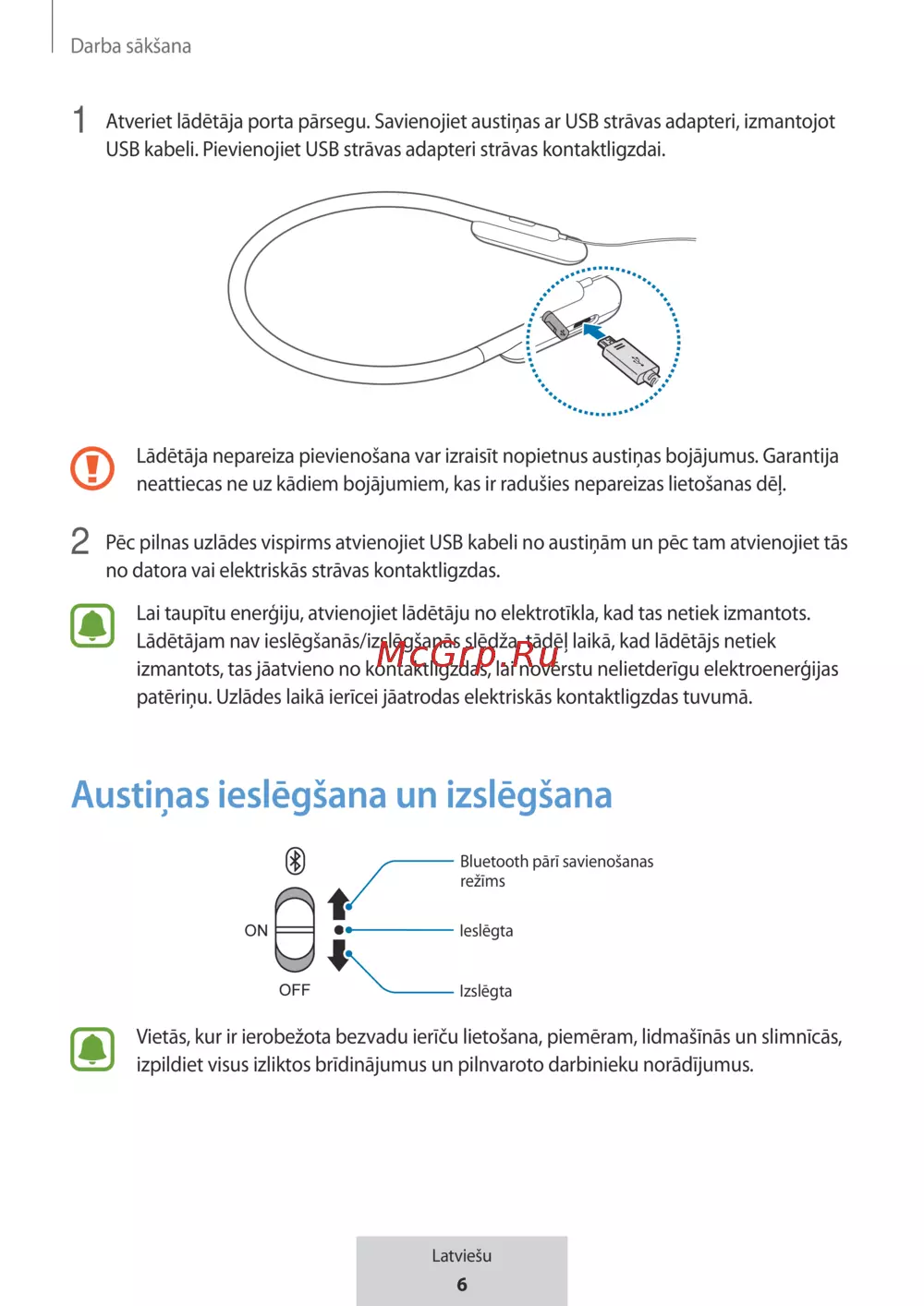 Lādētāja nepareiza pievienošana var izraisīt nopietnus austiņas bojājumus. Garantija