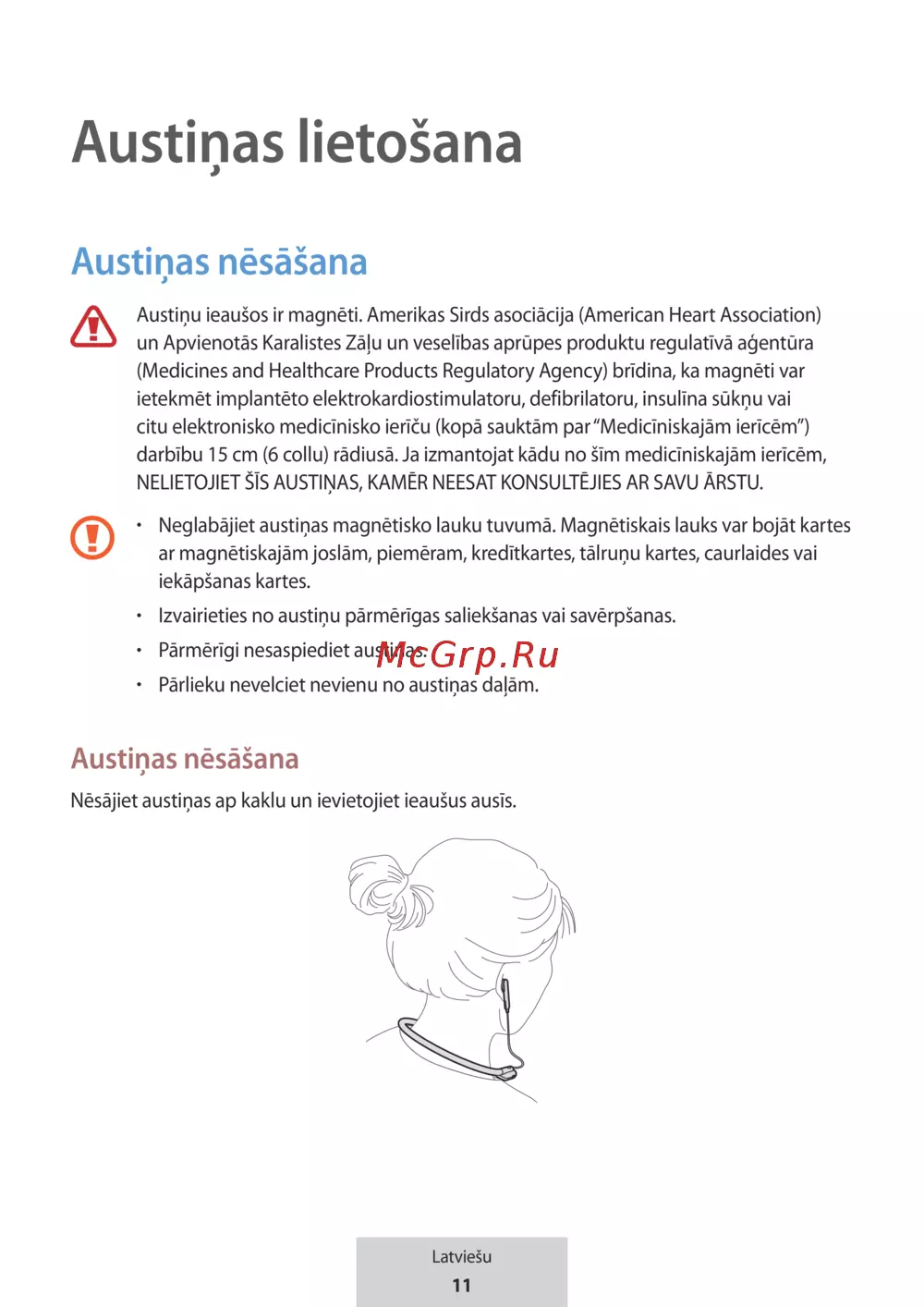 Nēsājiet austiņas ap kaklu un ievietojiet ieaušus ausīs.