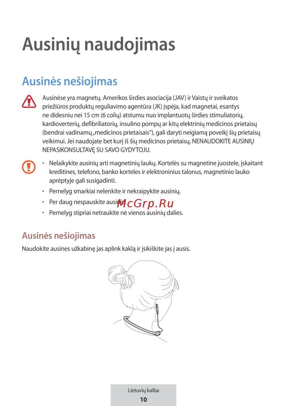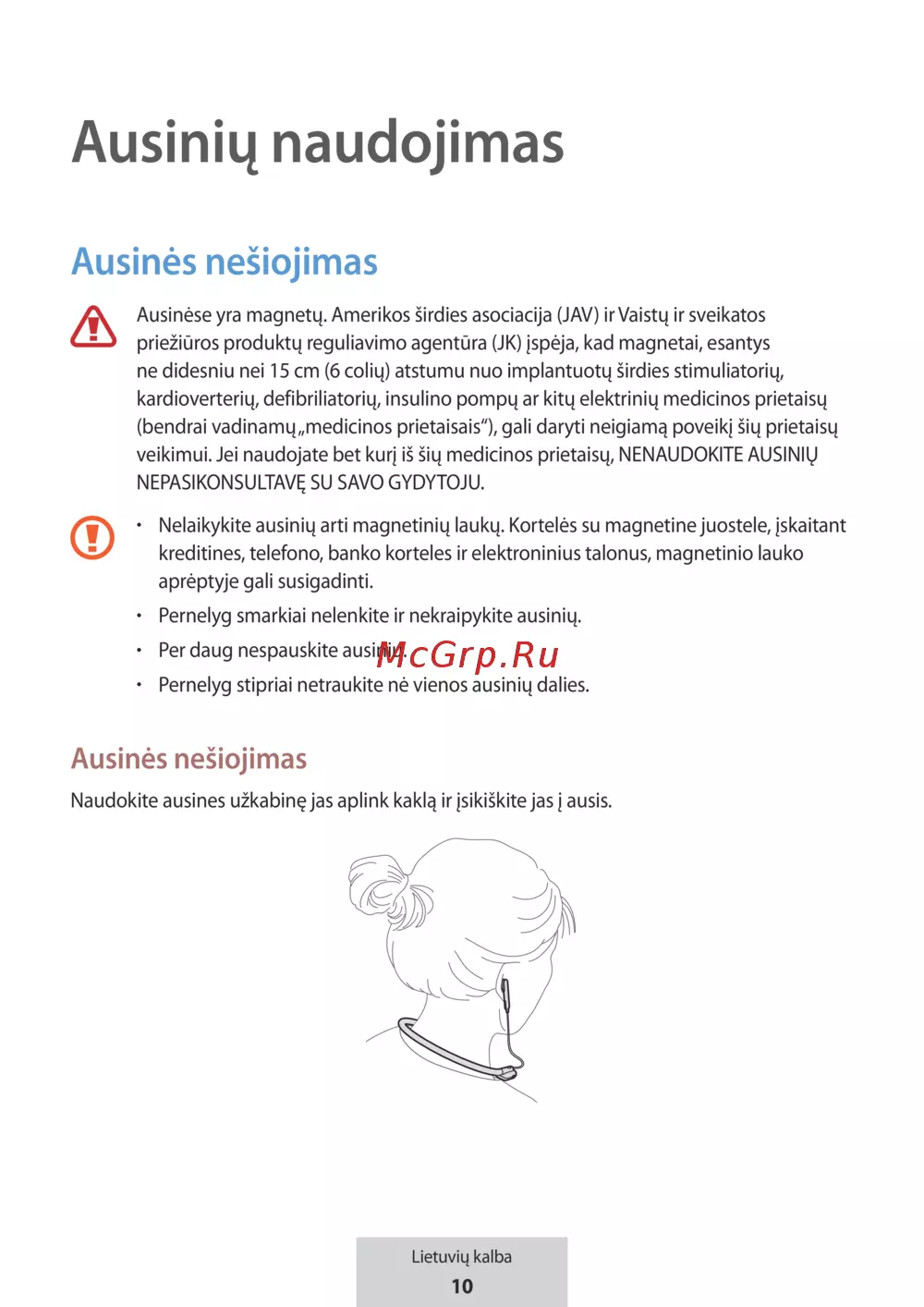 Naudokite ausines užkabinę jas aplink kaklą ir įsikiškite jas į ausis.