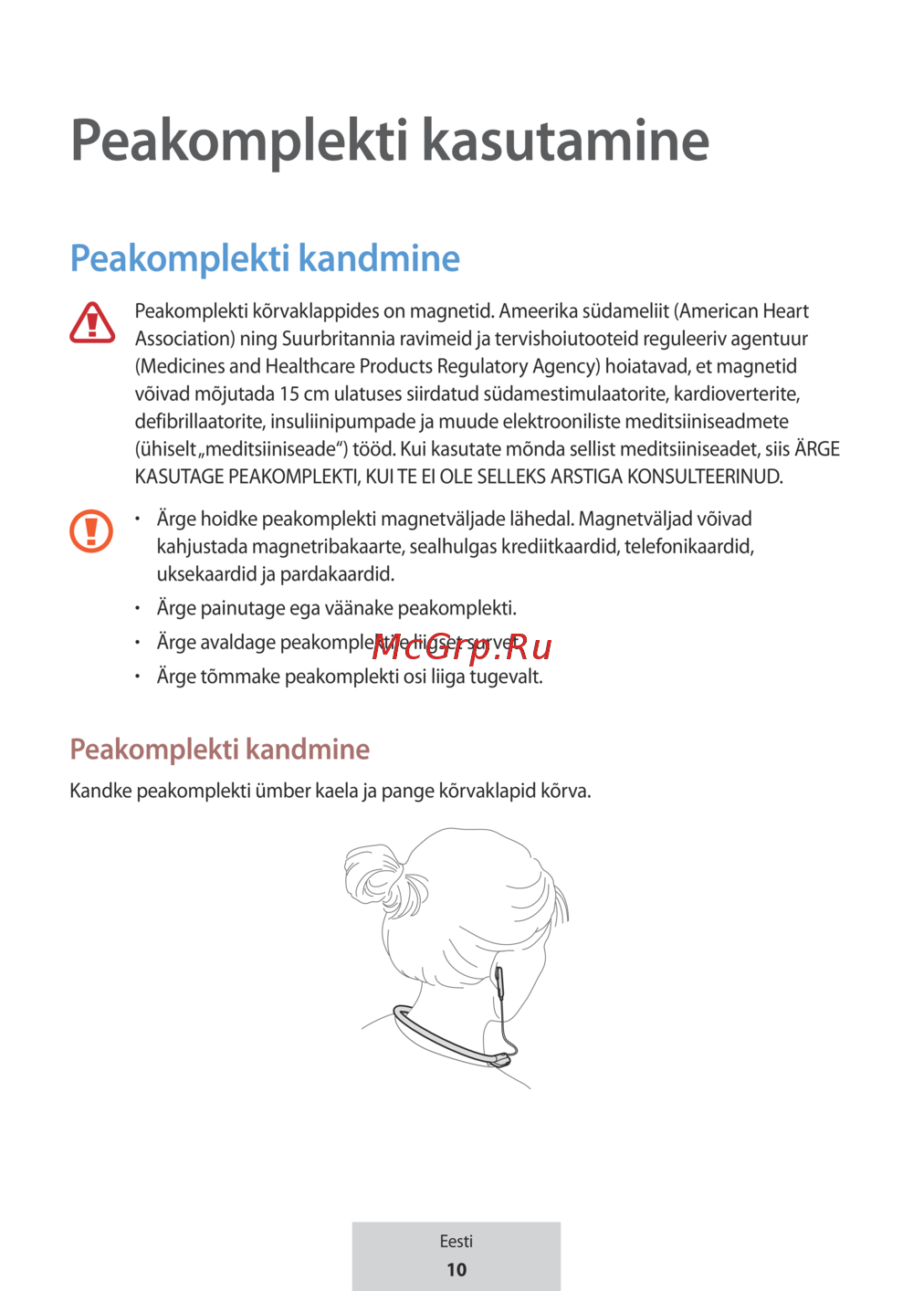 Kandke peakomplekti ümber kaela ja pange kõrvaklapid kõrva.