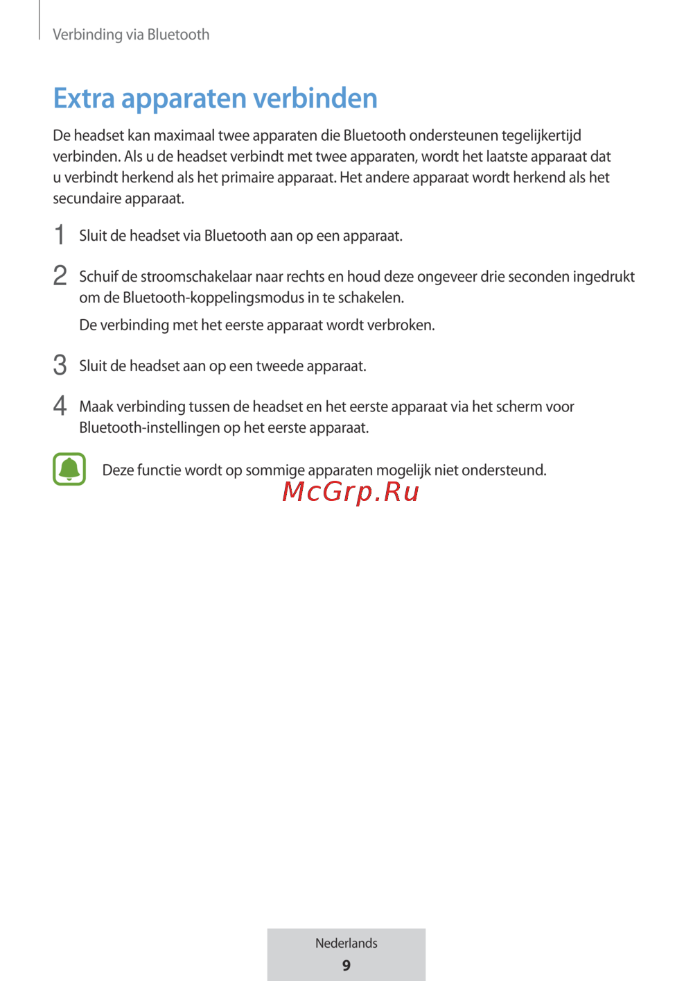 De headset kan maximaal twee apparaten die Bluetooth ondersteunen tegelijkertijd