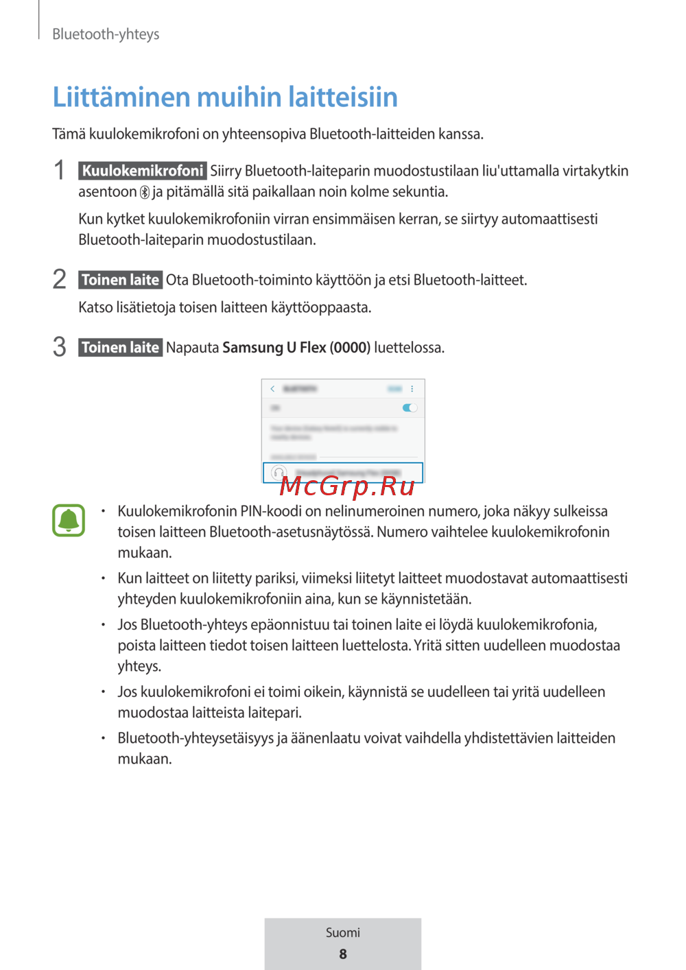 Jos Bluetooth-yhteys epäonnistuu tai toinen laite ei löydä kuulokemikrofonia,