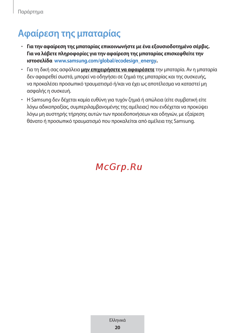 Η Samsung δεν δέχεται καμία ευθύνη για τυχόν ζημιά ή απώλεια (είτε συμβατική είτε