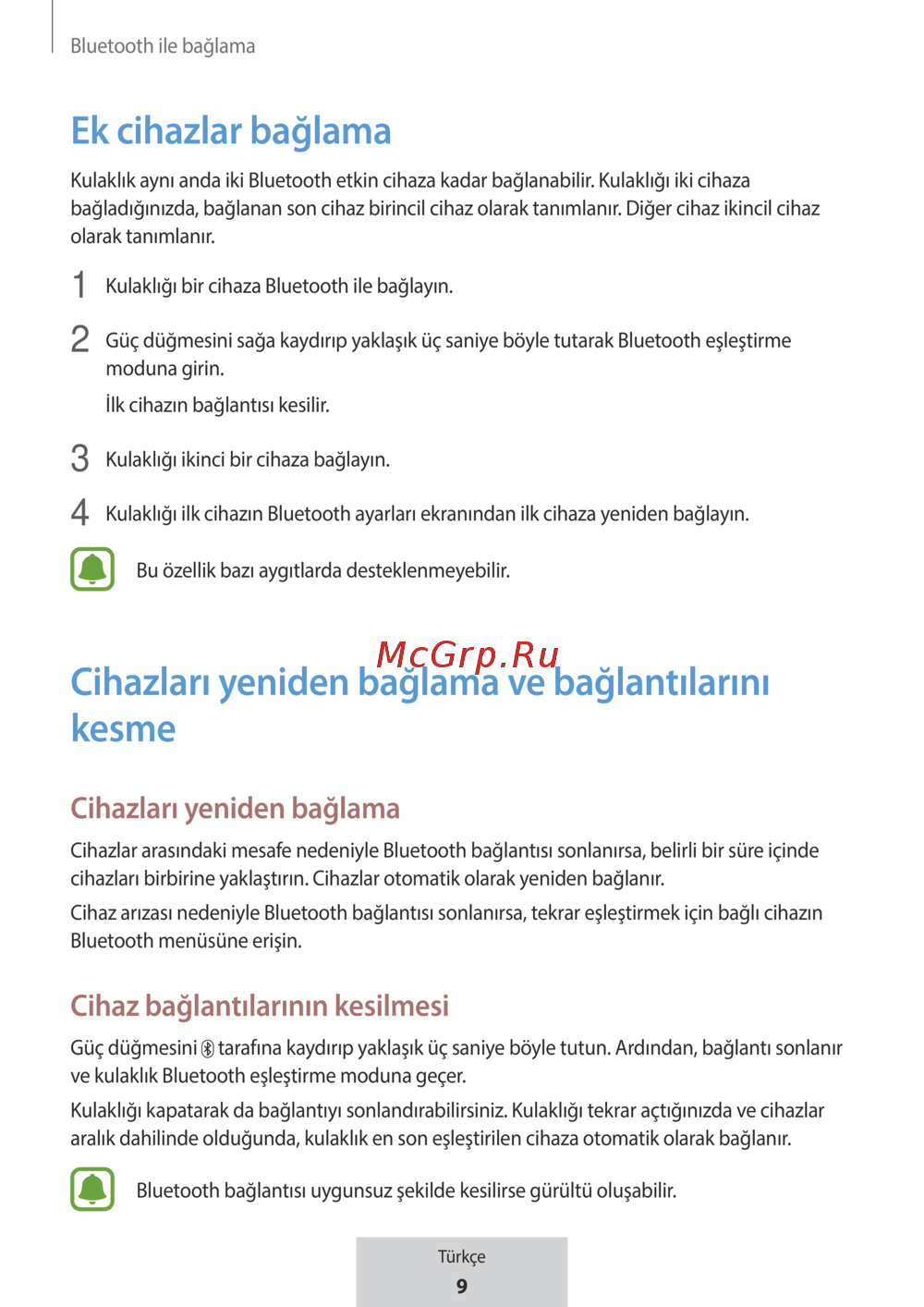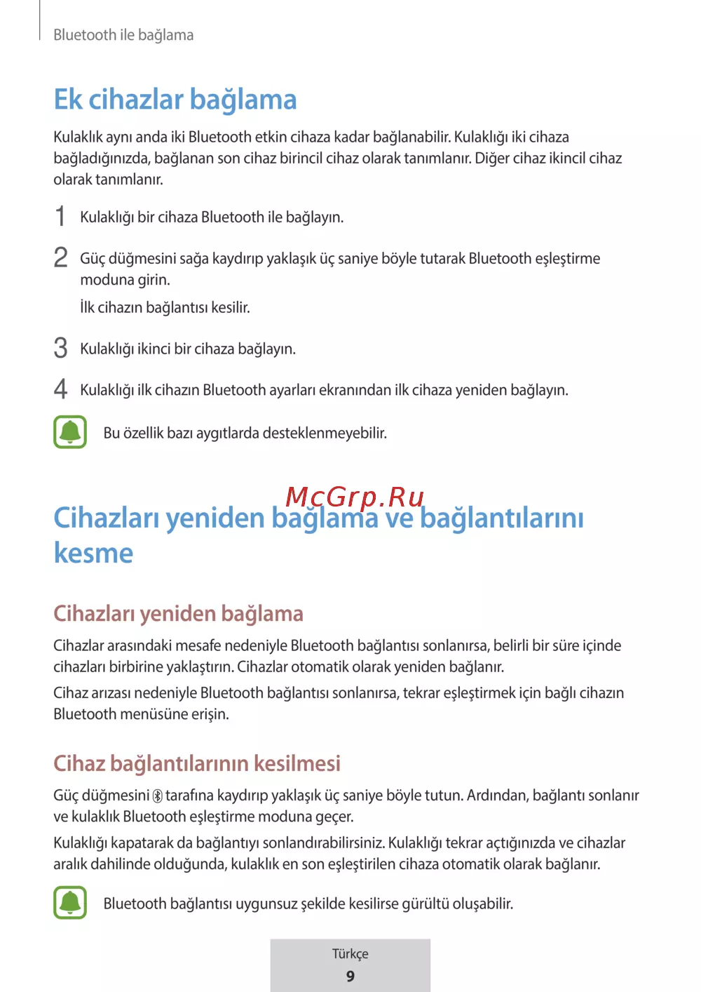 Kulaklık aynı anda iki Bluetooth etkin cihaza kadar bağlanabilir. Kulaklığı iki cihaza