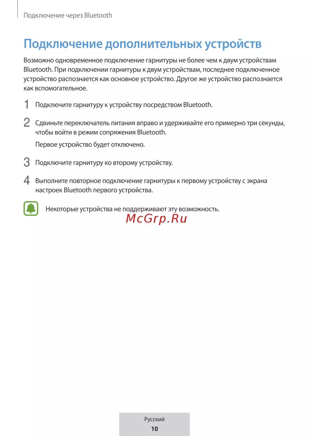 Возможно одновременное подключение гарнитуры не более чем к двум устройствам