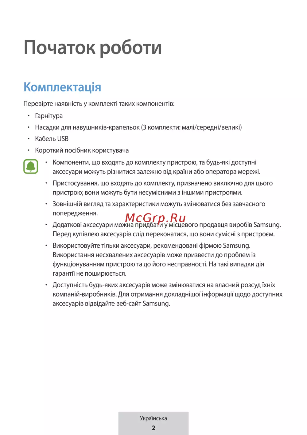 Додаткові аксесуари можна придбати у місцевого продавця виробів Samsung.