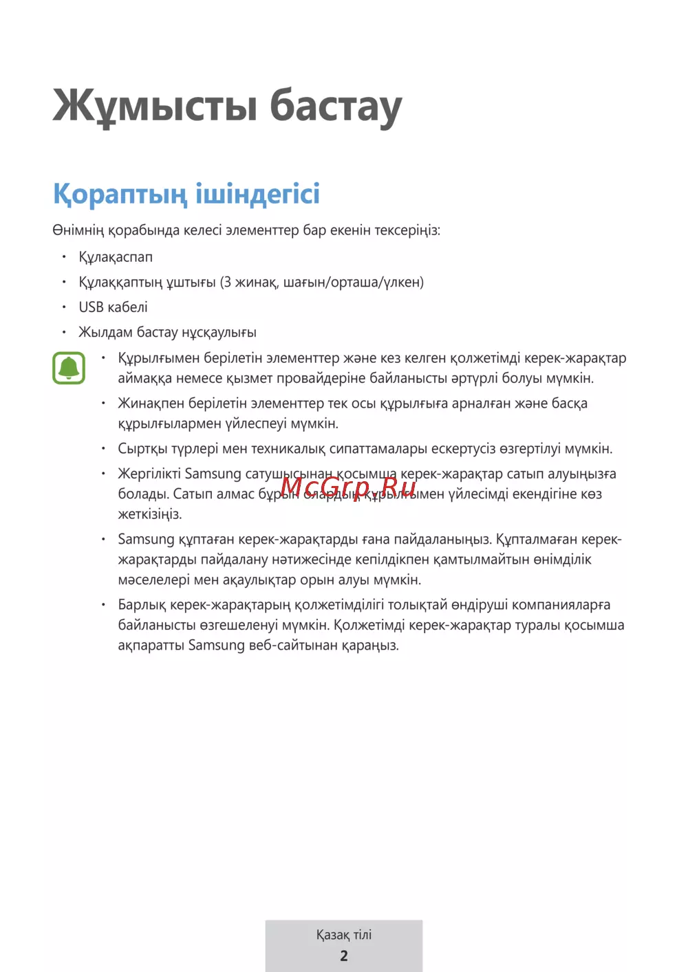 Samsung құптаған керек-жарақтарды ғана пайдаланыңыз. Құпталмаған керек-
