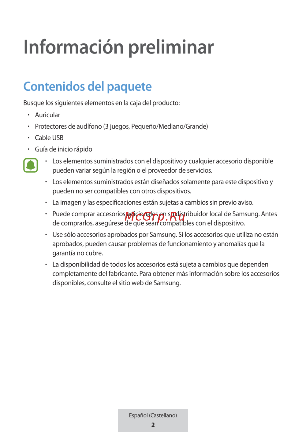 Puede comprar accesorios adicionales en su distribuidor local de Samsung. Antes