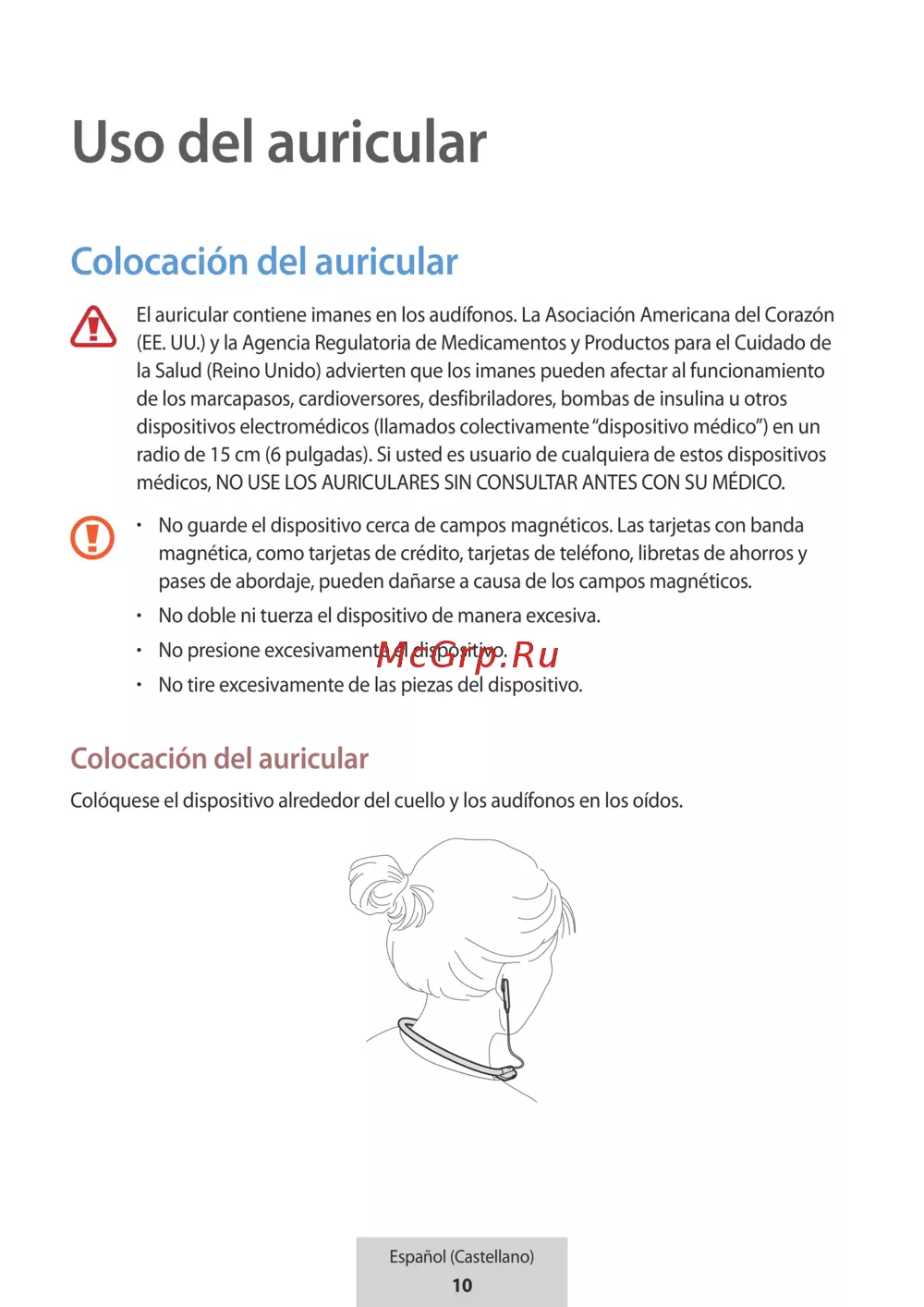 Colóquese el dispositivo alrededor del cuello y los audífonos en los oídos.