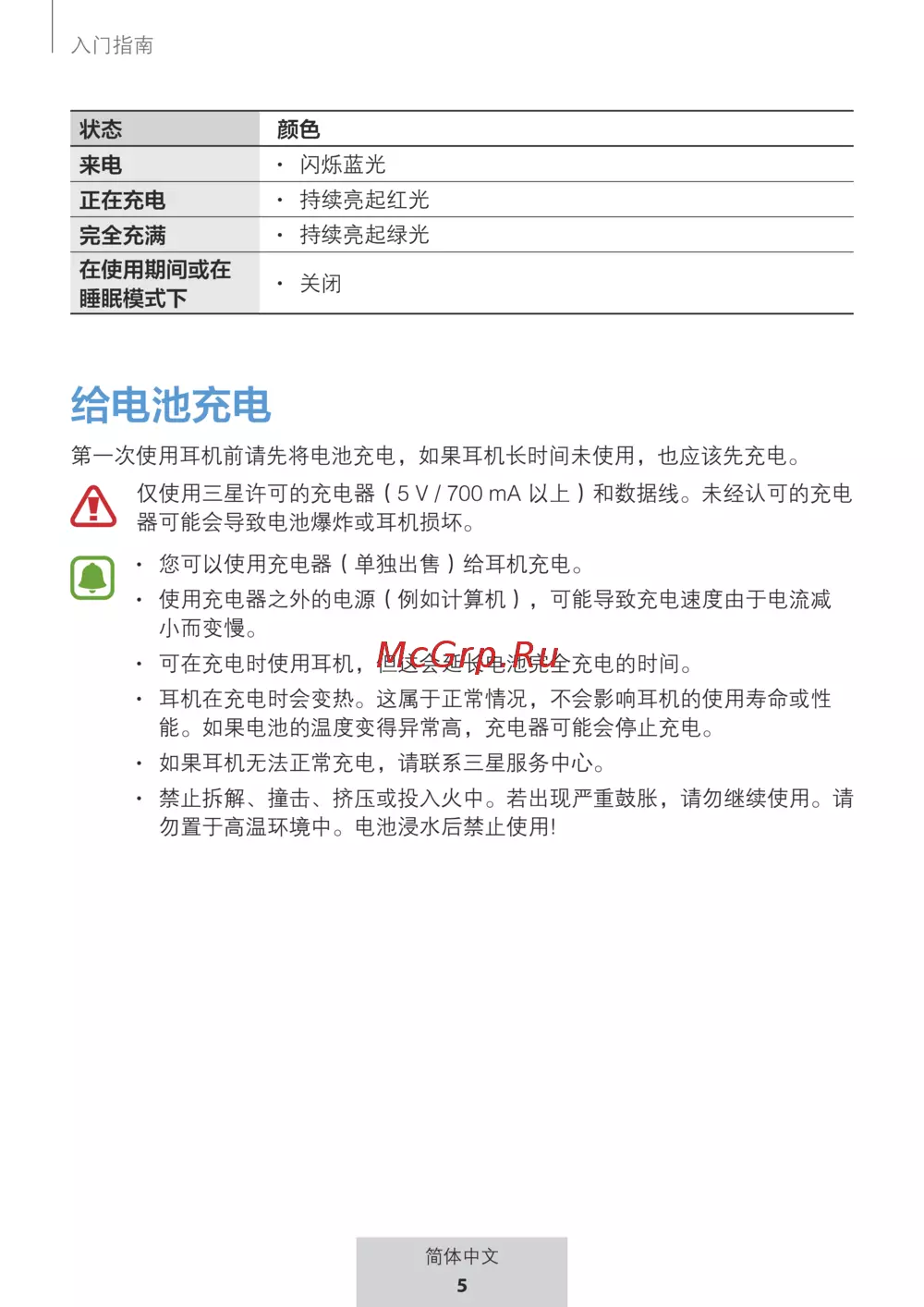 仅使用三星许可的充电器(5 V / 700 mA 以上)和数据线。未经认可的充电