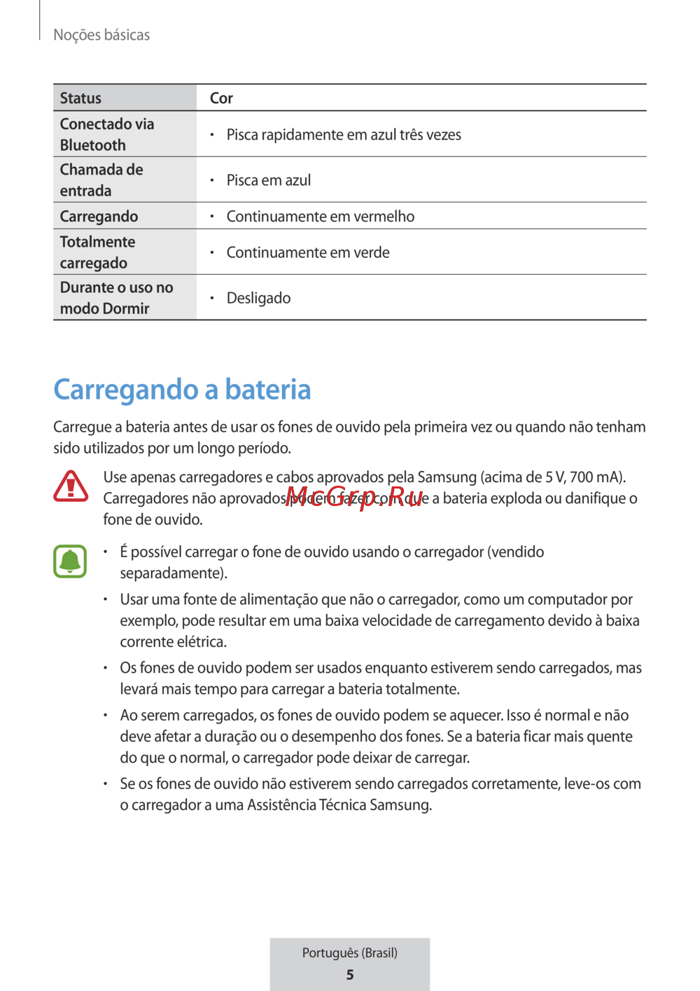 Use apenas carregadores e cabos aprovados pela Samsung (acima de 5 V, 700 mA).