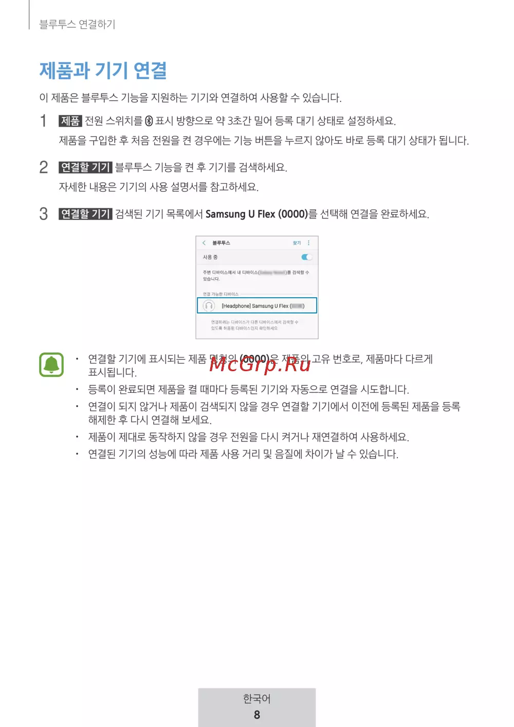 연결할 기기 검색된 기기 목록에서 Samsung U Flex (0000)를 선택해 연결을 완료하세요.