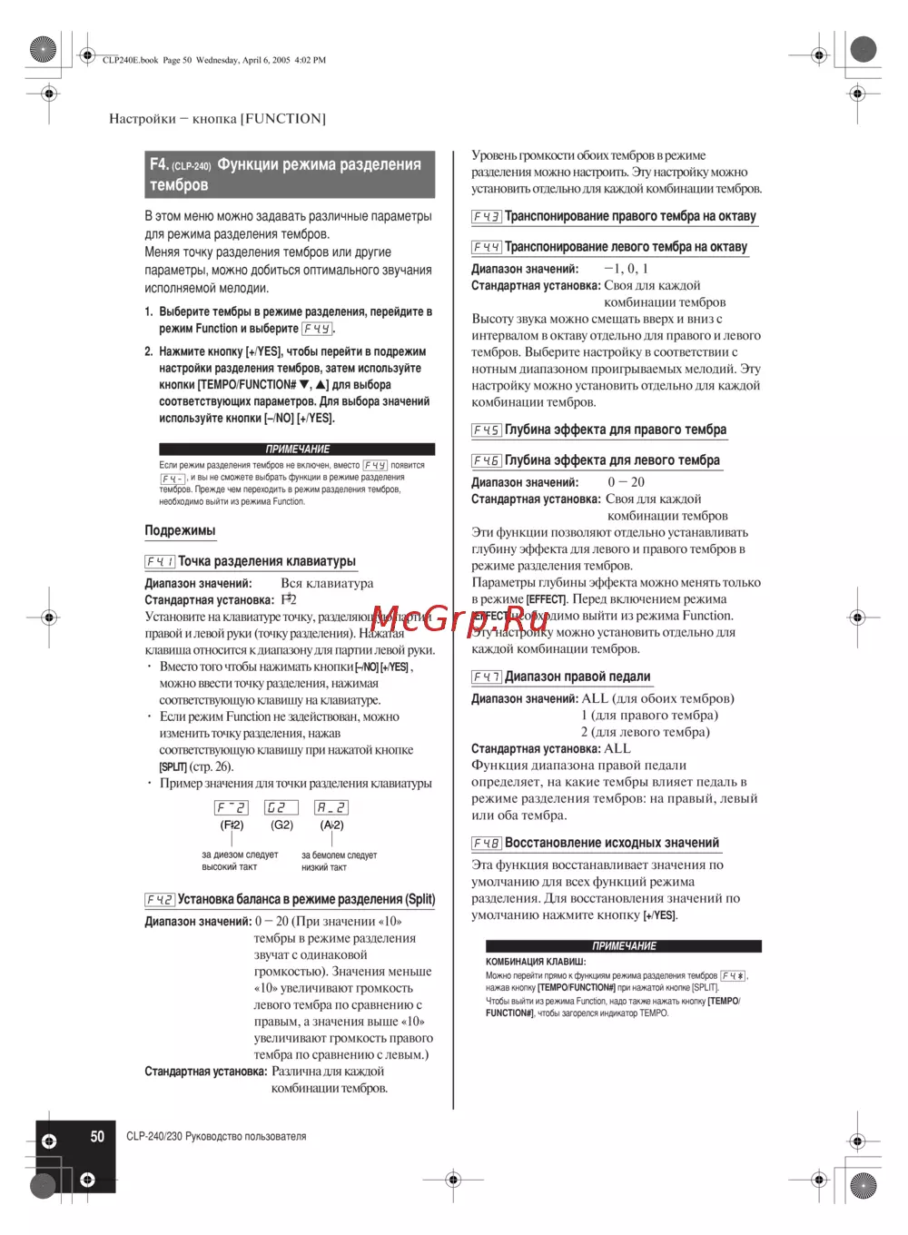 CLP240E book Page 50 Wednesday April 6 2005 4 02 PM Настройки кнопка FUNCTION F4 CLP 240 Функции режима разделения тембров В этом меню можно задавать различные параметры Уровень громкости обоих тембров в режиме разделения можно настроить Эту настройку можно установить отдельно для каждой комбинации тембров ОН Транспонирование правого тембра на октаву для режима разделения тембров Меняя точку разделения тембров или другие параметры можно добиться оптимального звучания исполняемой мелодии 1 Выберите тембры в режиме разделения перейдите в режим Function и выберите F ч а 2 Нажмите кнопку YES чтобы перейти в подрежим настройки разделения тембров затем используйте кнопки TEMPO FUNCTION для выбора соответствующих параметров Для выбора значений используйте кнопки NO YES 5 44 Транспонирование левого тембра на октаву Диапазон значений 1 0 1 Стандартная установка Своя для каждой комбинации тембров Высоту звука можно смешать вверх и вниз с интервалом в октаву отдельно для правого и левого тембров Выберите настройку в соответствии с нотным диапазоном проигрываемых мелодий Эту настройку можно установить отдельно для каждой комбинации тембров F 45 Глубина эффекта для правого тембра ПРИМЕЧАНИЕ Если режим разделения тембров не включен вместо ЕЧЧ появится ip Ч 1 и вы не сможете выбрать функции в режиме разделения тембров Прежде чем переходить в режим разделения тембров необходимо выйти из режима Function Подрежимы FWIТочка разделения клавиатуры Диапазон значений Вся клавиатура Стандартная установка F2 Установите на клавиатуре точку разделяющую партии правой и левой руки точку разделения Нажатая клавиша относится к диапазону для партии левой руки Вместо того чтобы нажимать кнопки NO YES можно ввести точку разделения нажимая соответствующую клавишу на клавиатуре Если режим Function не задействован можно изменить точку разделения нажав соответствующую клавишу при нажатой кнопке SPLIT стр 26 Пример значения для точки разделения клавиатуры И ш И R2 G2 F 451 Глубина эффекта для левого тембра Диапазон значений 0 20 Стандартная установка Своя для каждой комбинации тембров Эти функции позволяют отдельно устанавливать глубину эффекта для левого и правого тембров в режиме разделения тембров Параметры глубины эффекта можно менять только в режиме EFFECT Перед включением режима ЕРГЕСТ необходимо выйти из режима Function Эту настройку можно установить отдельно для каждой комбинации тембров F47 Диапазон правой педали Диапазон значений ALL для обоих тембров 1 для правого тембра 2 для левого тембра Стандартная установка ALL Функция диапазона правой педали определяет на какие тембры влияет педаль в режиме разделения тембров на правый левый или оба тембра A2 РЧВ Восстановление исходных значений за диезом следует высокий такт за бемолем следует низкий такт ЕЧВ Установка баланса в режиме разделения Split Диапазон значений 0 20 При значении 10 тембры в режиме разделения звучат с одинаковой громкостью Значения меньше 10 увеличивают громкость левого тембра по сравнению с правым а значения выше 10 увеличивают громкость правого тембра по сравнению с левым Стандартная установка Различна для каждой комбинации тембров 50 CLP 240 230 Руководство пользователя Эта функция восстанавливает значения по умолчанию для всех функций режима разделения Для восстановления значений по умолчанию нажмите кнопку YES ПРИМЕЧАНИЕ КОМБИНАЦИЯ КЛАВИ