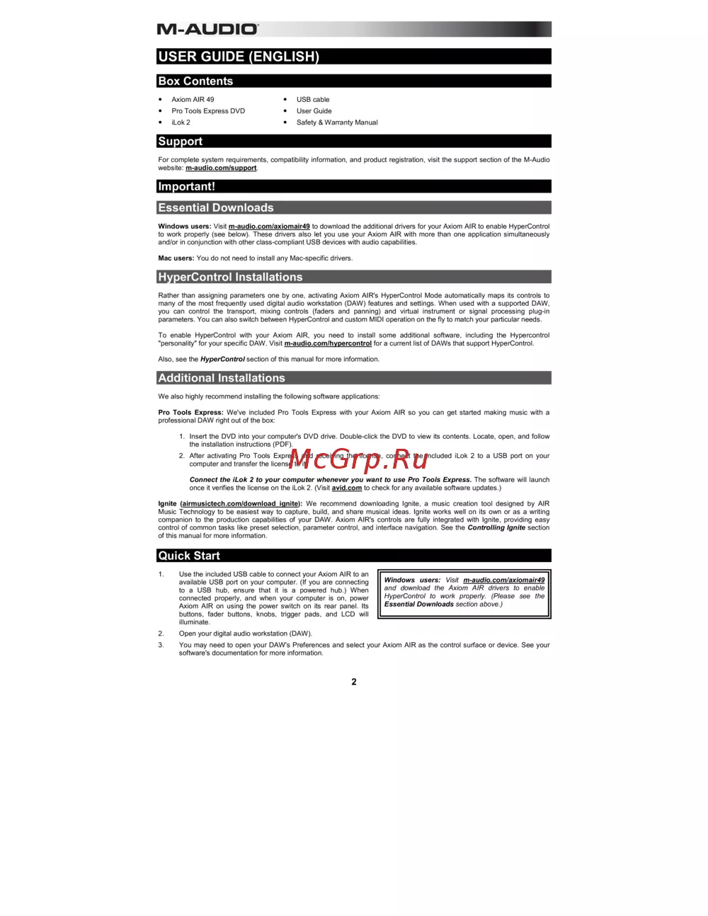 Windows users: Visit m-audio.com/axiomair49 to download the additional drivers for your Axiom AIR to enable HyperControl