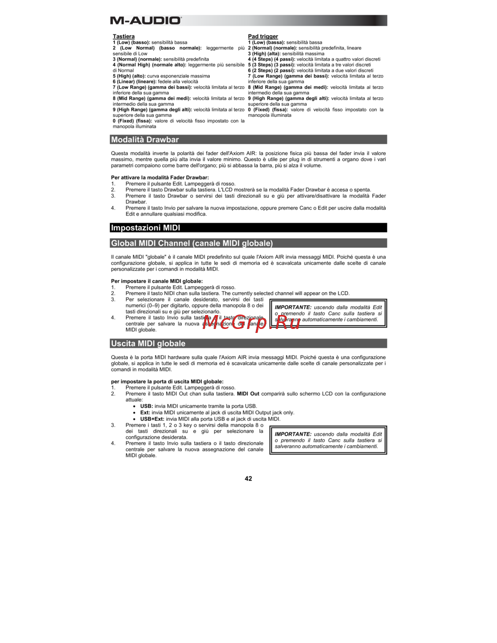 M-Audio Axiom AIR 49 — guida alle impostazioni della tastiera e modalità MIDI [42/60]