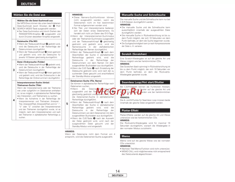 Erfahren Sie, wie Sie Dateien auf MP3-Discs suchen und verschiedene Wiedergabefunktionen nutzen können. Entdecken Sie manuelle und schnelle Suchmethoden sowie Scratch- und Loop-Funktionen.