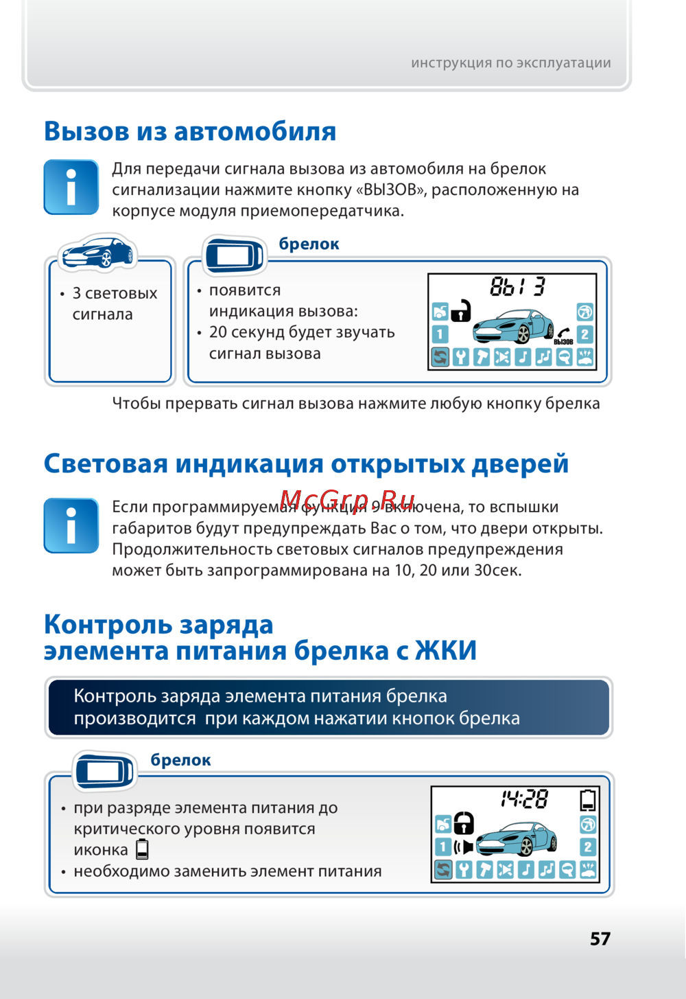 - Контроль заряда элемента питания брелка производится при каждом нажатии кнопок брелка p.57