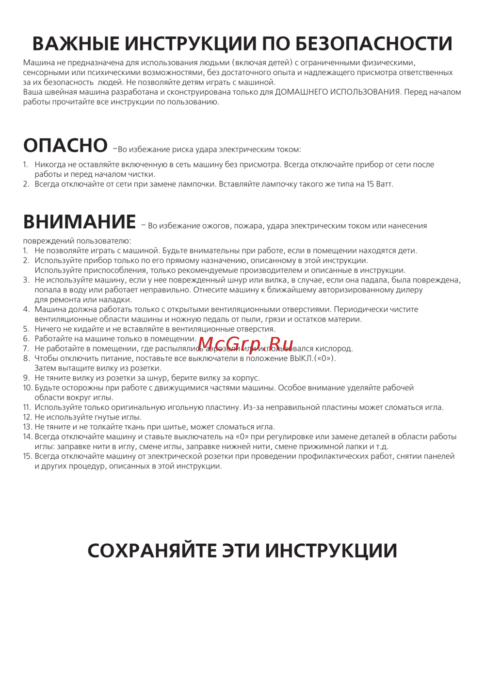 Ваша швейная машина разработана и сконструирована только для ДОМАШНЕГО ИСПОЛЬЗОВАНИЯ. Перед началом