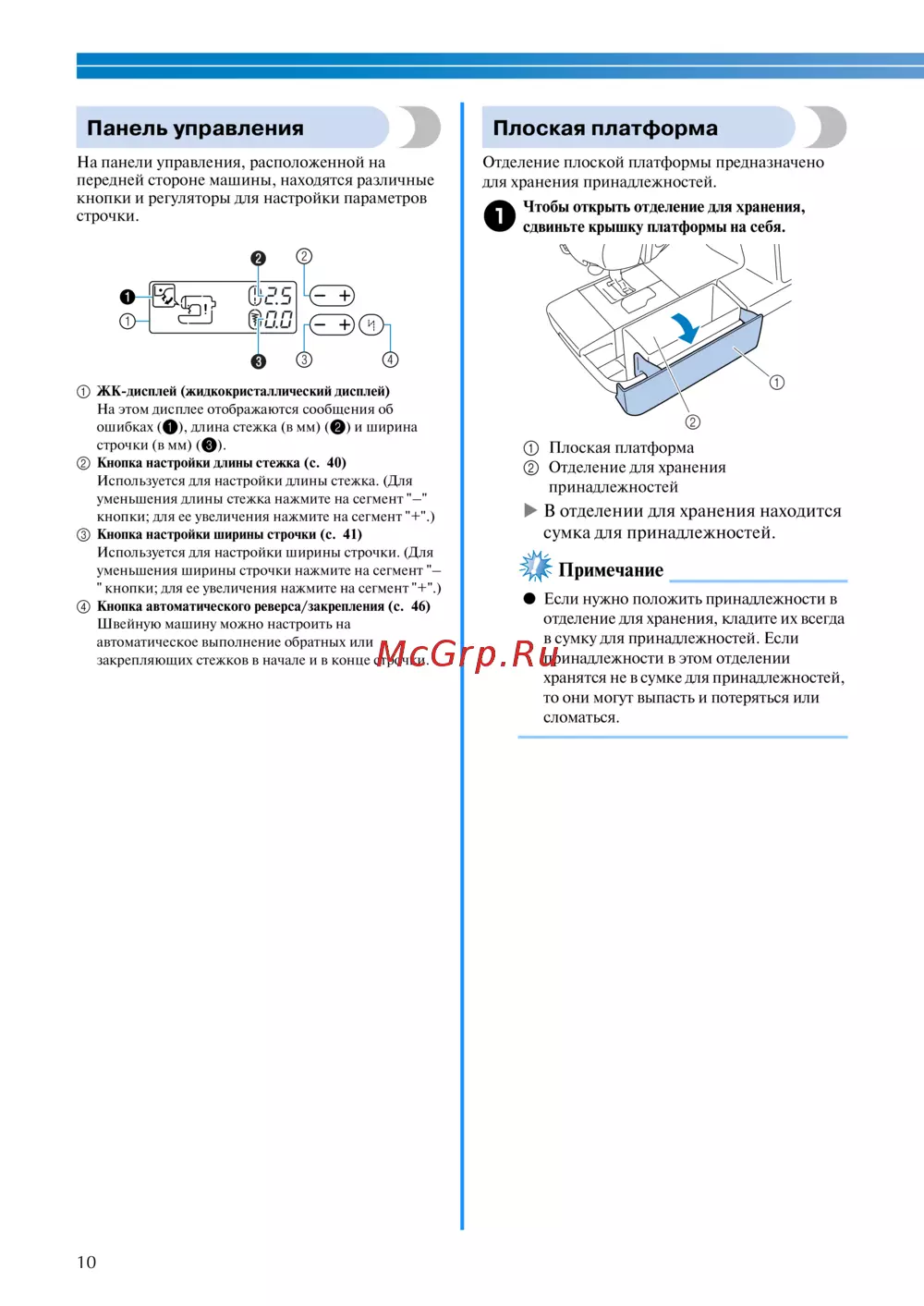 - Зона иглы и прижимной лапки p.10