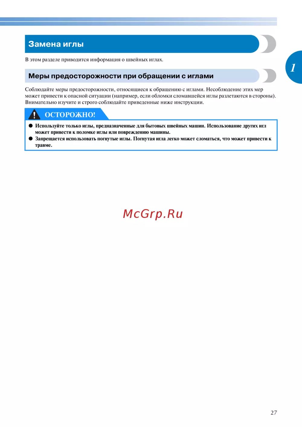 ● Запрещается использовать погнутые иглы. Погнутая игла легко может сломаться, что может привести к