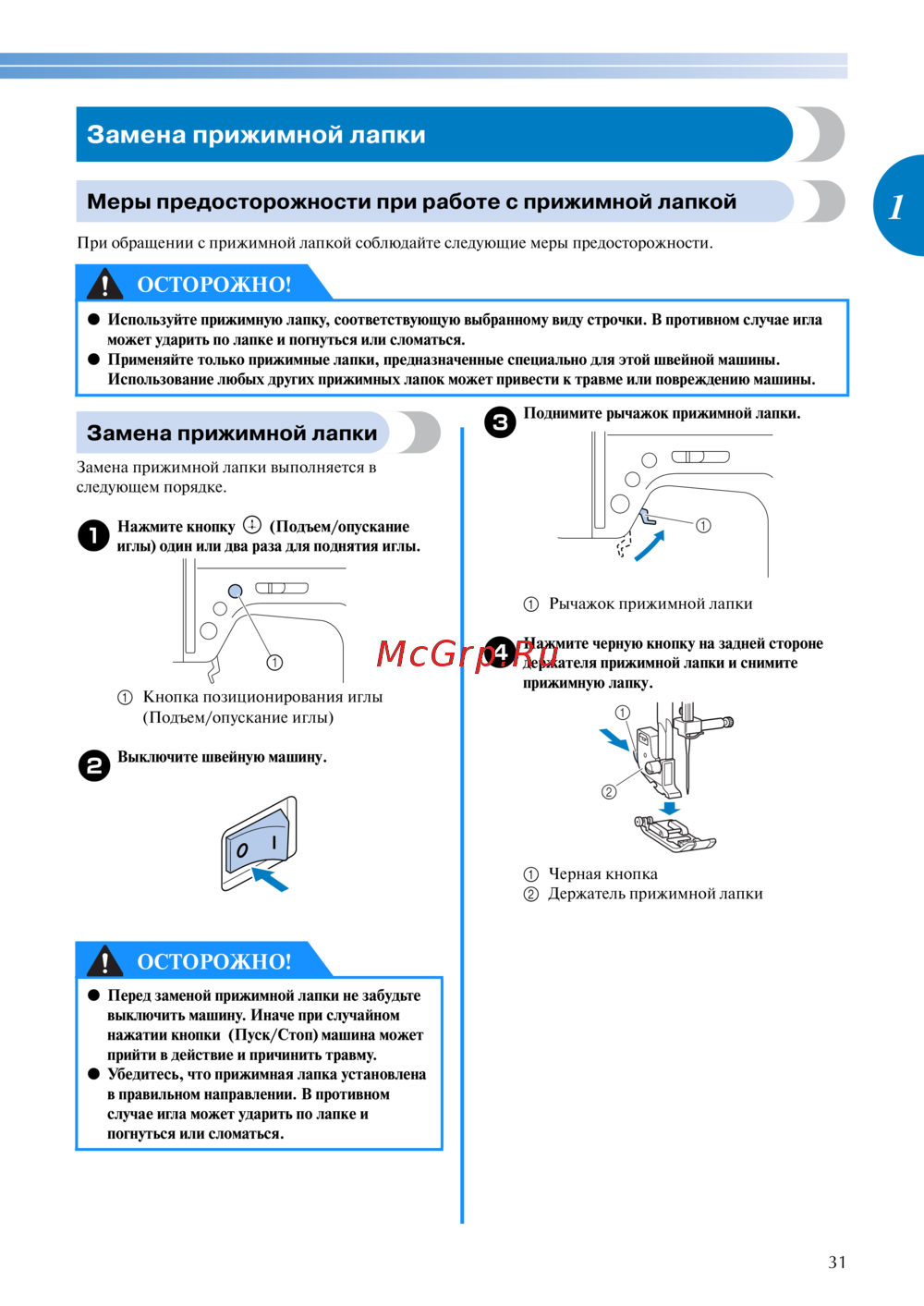 Использование любых других прижимных лапок может привести к травме или повреждению машины.