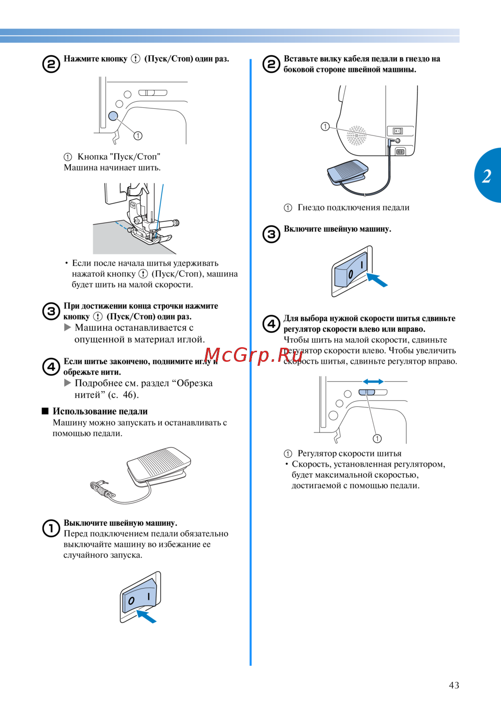 - Выполнив закрепляющие стежки швейная машина автоматически останавливается p.61