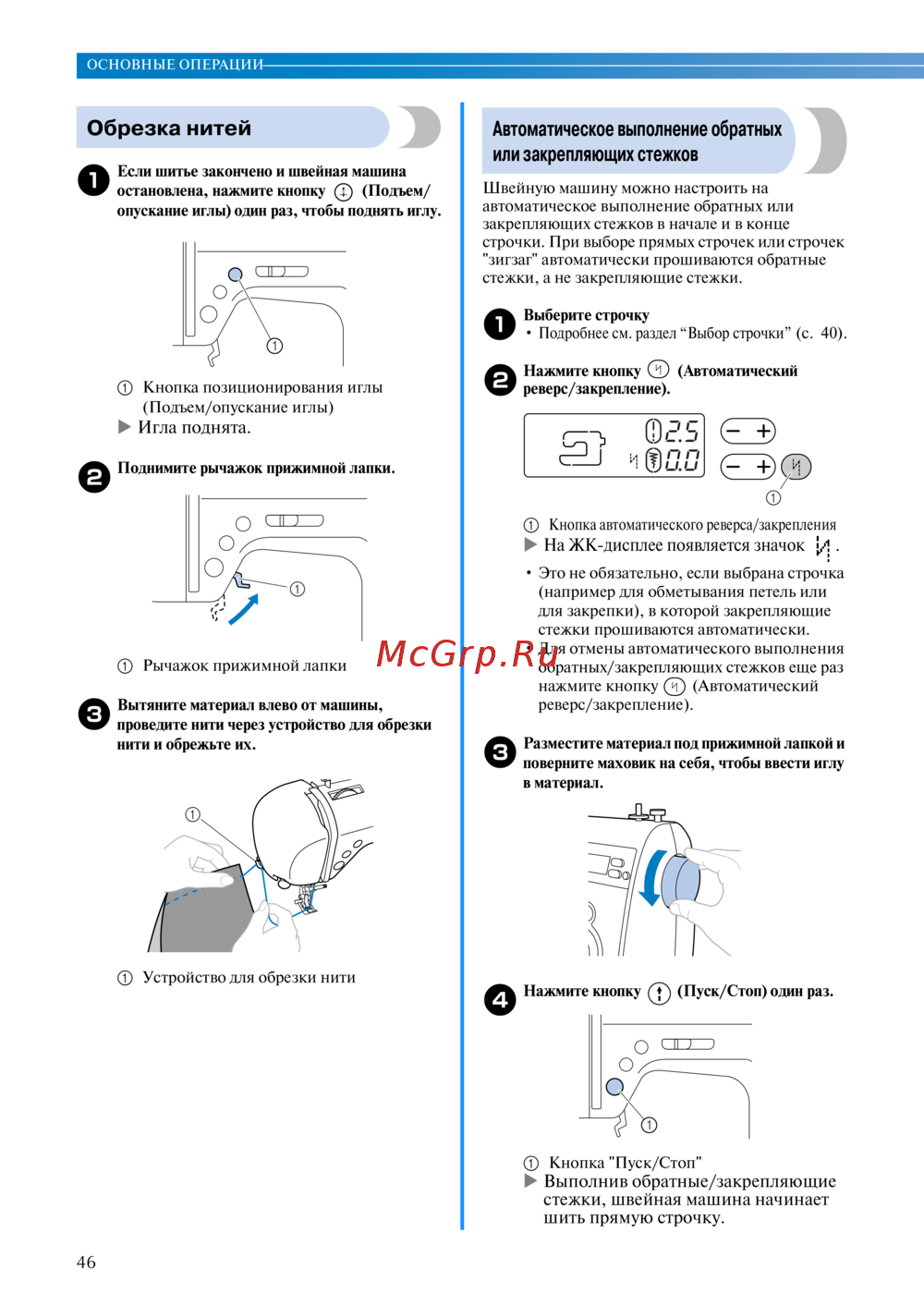 - Выполнив закрепляющие стежки швейная машина автоматически останавливается p.61