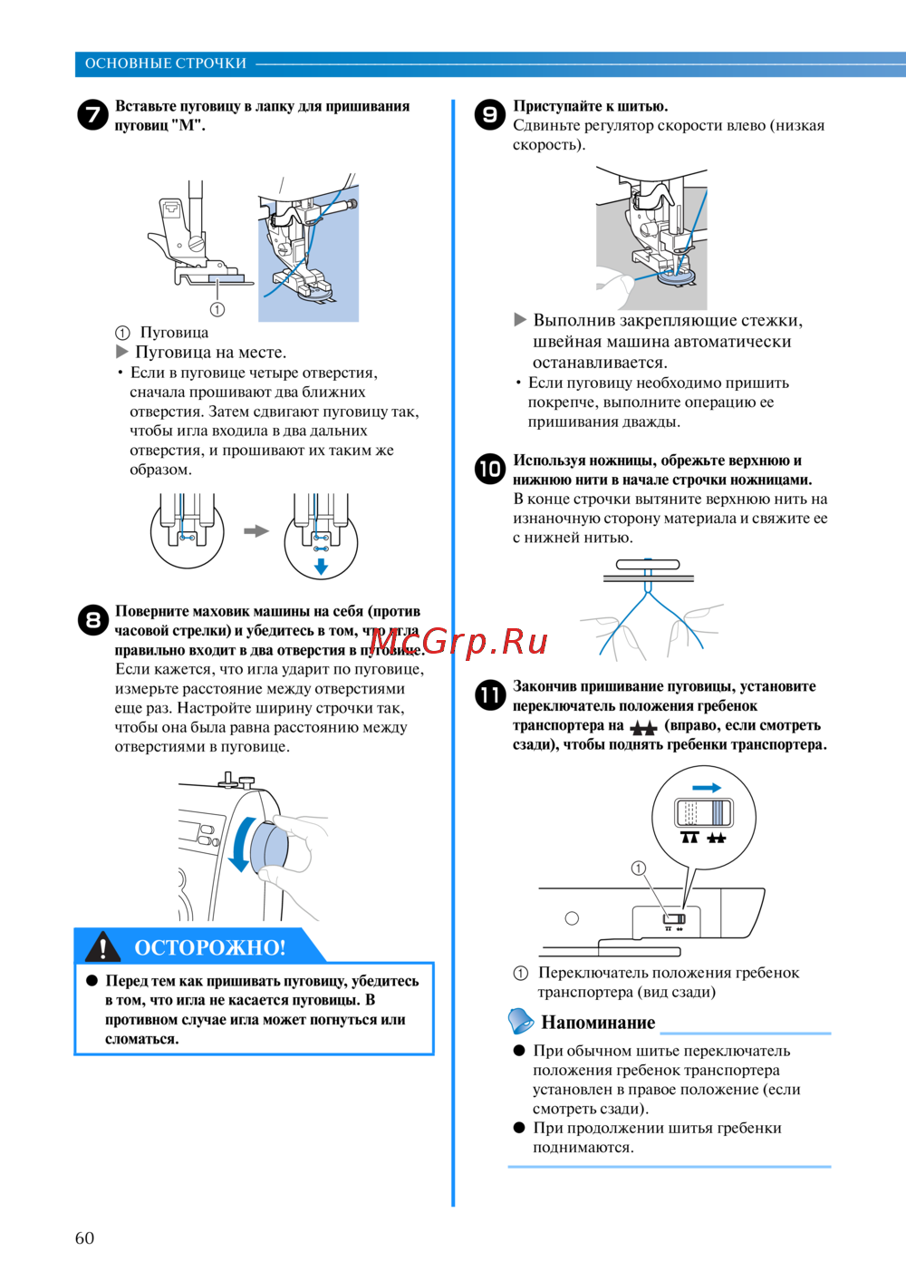 - Выполнив закрепляющие стежки швейная машина автоматически останавливается p.61