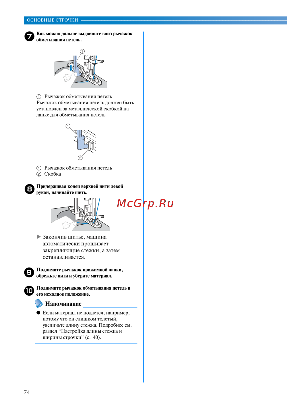 - Выполнив закрепляющие стежки швейная машина автоматически останавливается p.61